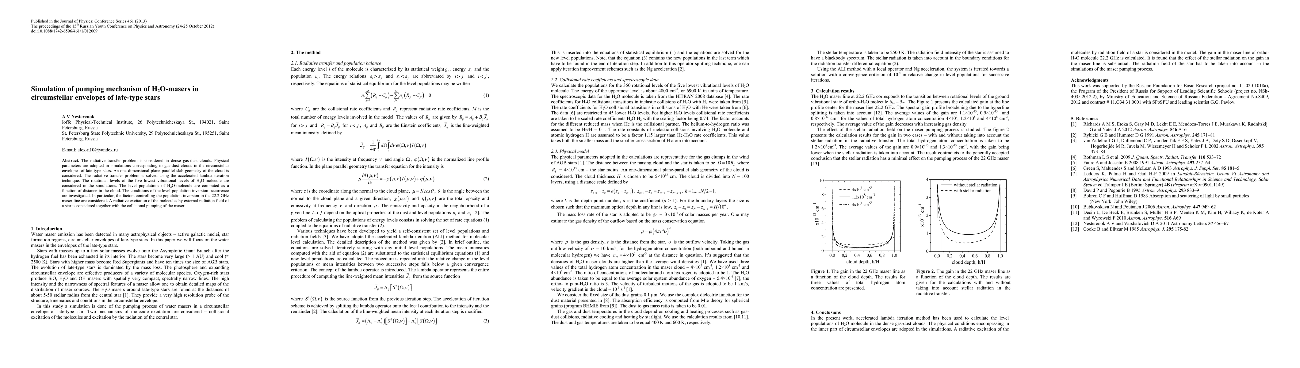 The radiative transfer problem is considered in dense gas-dust clouds. Physical parameters are adopted in simulations corresponding to gas-dust clouds in the circumstellar envelopes of late-type stars. An one-dimensional plane-parallel slab geometry of the cloud is considered. The radiative transfer problem is solved using the accelerated lambda iteration technique. The rotational levels of the five lowest vibrational levels of H2O-molecule are considered in the simulations. The level populations of H2O-molecule are computed as a function of distance in the cloud. The conditions of the level population inversion occurrence are investigated. In particular, the factors controlling the population inversion in the 22.2 GHz maser line are considered. A radiative excitation of the molecules by external radiation field of a star is considered together with the collisional pumping of the maser.