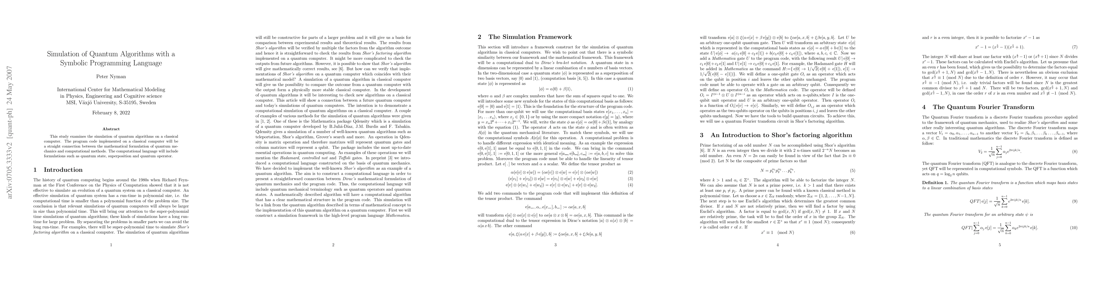 This study explores simulating quantum algorithms on classical computers using a symbolic programming language that directly translates quantum mechanics principles into computational methods, incorporating concepts like quantum state, superposition, and quantum operators.