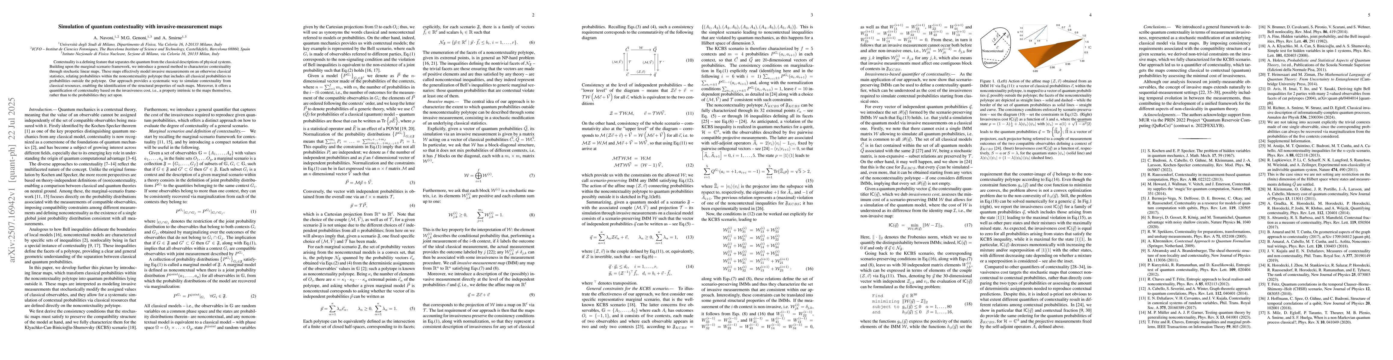 Contextuality is a defining feature that separates the quantum from the classical descriptions of physical systems. Building upon the marginal-scenario framework, we introduce a general method to characterize contextuality through stochastic linear maps. These maps effectively model invasive measurements on an otherwise classical statistics, relating probabilities within the noncontextuality polytope that includes all classical probabilities to probabilities outside the polytope. Our approach provides a systematic way to simulate contextuality from classical resources, enabling the identification of the structural properties of such maps. Moreover, it offers a quantification of contextuality based on the invasiveness cost, i.e., a property intrinsic to the maps themselves, rather than to the probabilities they act upon.