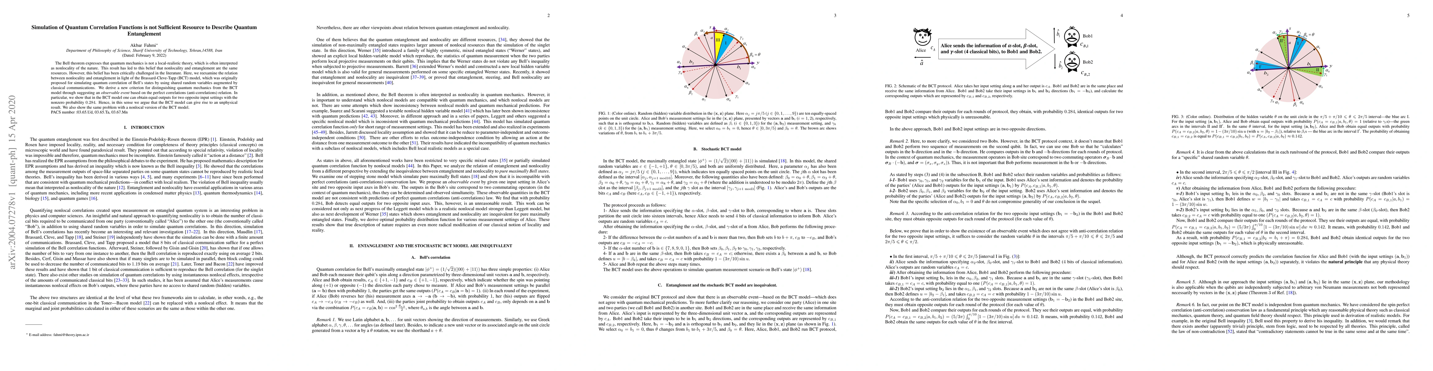 The Bell theorem expresses that quantum mechanics is not a local-realistic theory, which is often interpreted as nonlocality of the nature. This result has led to this belief that nonlocality and entanglement are the same resources. However, this belief has been critically challenged in the literature. Here, we reexamine the relation between nonlocality and entanglement in light of the Brassard-Cleve-Tapp (BCT) model, which was originally proposed for simulating quantum correlation of Bell's states by using shared random variables augmented by classical communications. We derive a new criterion for distinguishing quantum mechanics from the BCT model through suggesting an observable event based on the perfect correlations (anti-correlations) relation. In particular, we show that in the BCT model one can obtain equal outputs for two opposite input settings with the nonzero probability 0.284. Hence, in this sense we argue that the BCT model can give rise to an unphysical result. We also show the same problem with a nonlocal version of the BCT model.