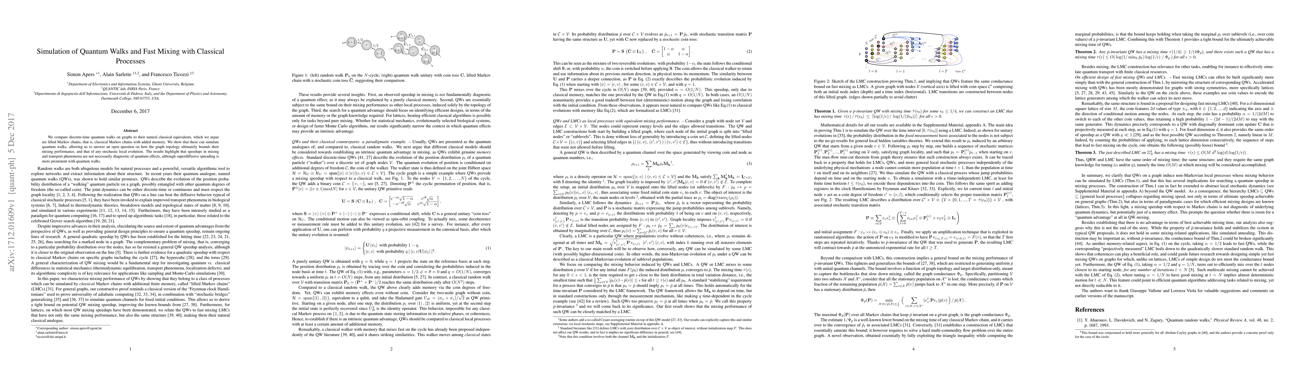 We compare discrete-time quantum walks on graphs to their natural classical equivalents, which we argue are lifted Markov chains, that is, classical Markov chains with added memory. We show that these can simulate quantum walks, allowing us to answer an open question on how the graph topology ultimately bounds their mixing performance, and that of any stochastic local evolution. The results highlight that speedups in mixing and transport phenomena are not necessarily diagnostic of quantum effects, although superdiffusive spreading is more prominent with quantum walks.