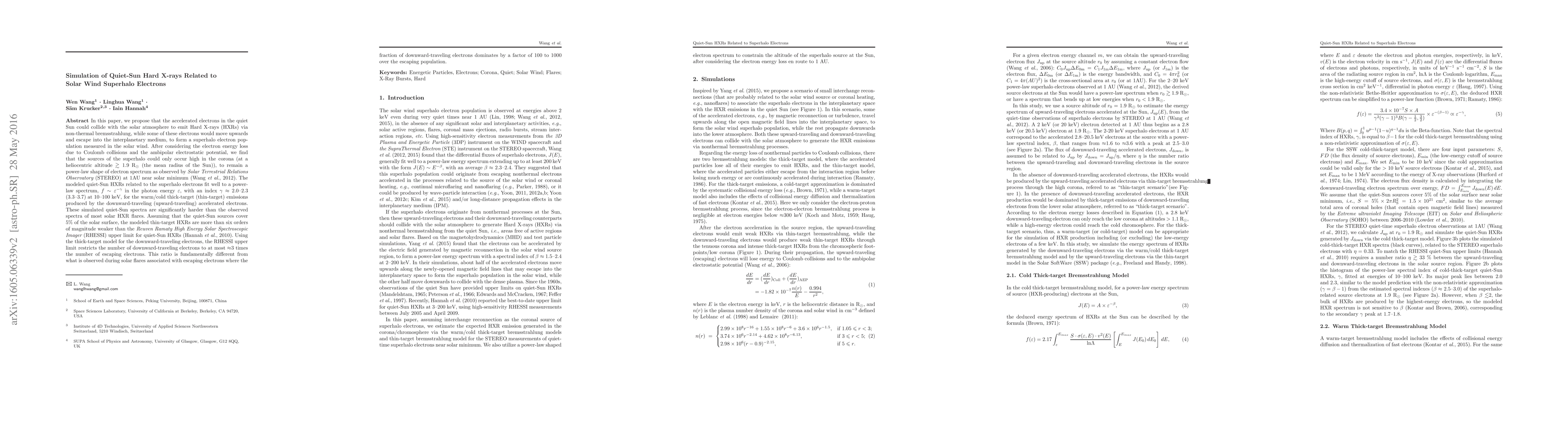 This paper proposes that accelerated electrons in the quiet Sun emit Hard X-rays via non-thermal bremsstrahlung, with some escaping into the solar wind to form a superhalo. The study finds that these sources occur high in the corona to maintain a power-law electron spectrum, and the modeled quiet-Sun HXR spectra are significantly harder than typical solar flares.