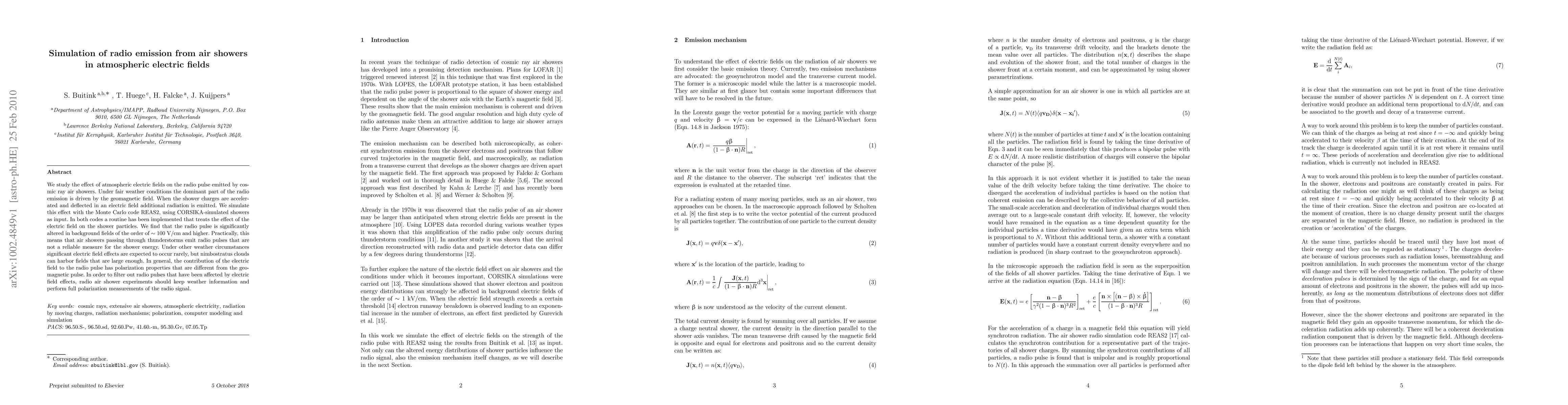 This paper investigates how atmospheric electric fields influence the radio emission from cosmic ray air showers, finding significant alterations in fields of ~100 V/cm or higher. To simulate these effects, the authors use REAS2 and CORSIKA codes, revealing that thunderstorms can distort radio pulses, complicating energy measurements.