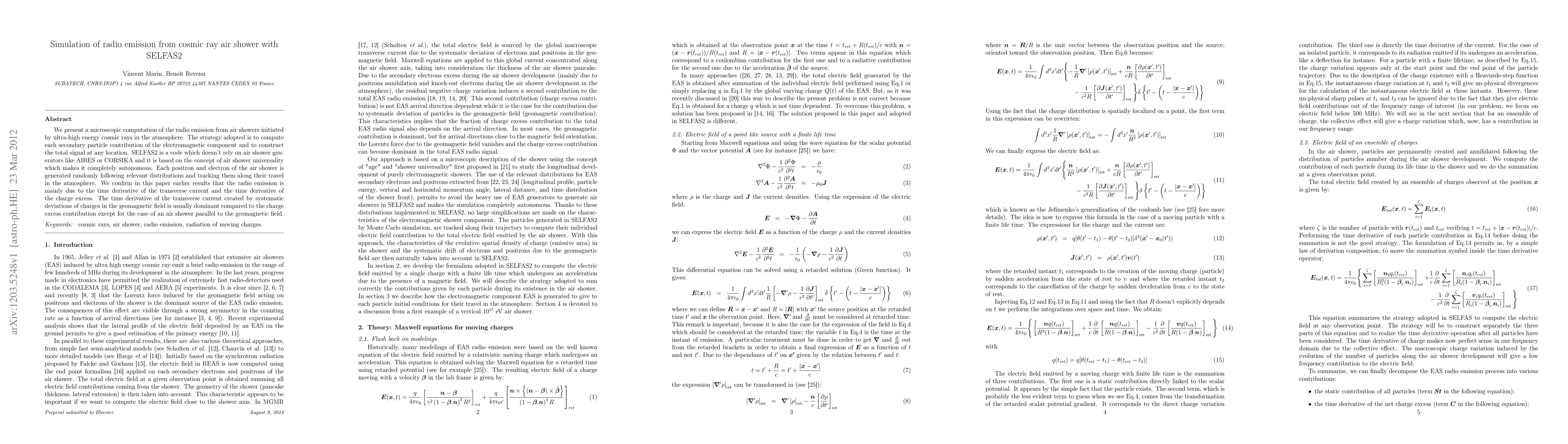 We present a microscopic computation of the radio emission from air showers initiated by ultra-high energy cosmic rays in the atmosphere. The strategy adopted is to compute each secondary particle contribution of the electromagnetic component and to construct the total signal at any location. SELFAS2 is a code which doesn't rely on air shower generators like AIRES or CORSIKA and it is based on the concept of air shower universality which makes it completely autonomous. Each positron and electron of the air shower is generated randomly following relevant distributions and tracking them along their travel in the atmosphere. We confirm in this paper earlier results that the radio emission is mainly due to the time derivative of the transverse current and the time derivative of the charge excess. The time derivative of the transverse current created by systematic deviations of charges in the geomagnetic field is usually dominant compared to the charge excess contribution except for the case of an air shower parallel to the geomagnetic field.