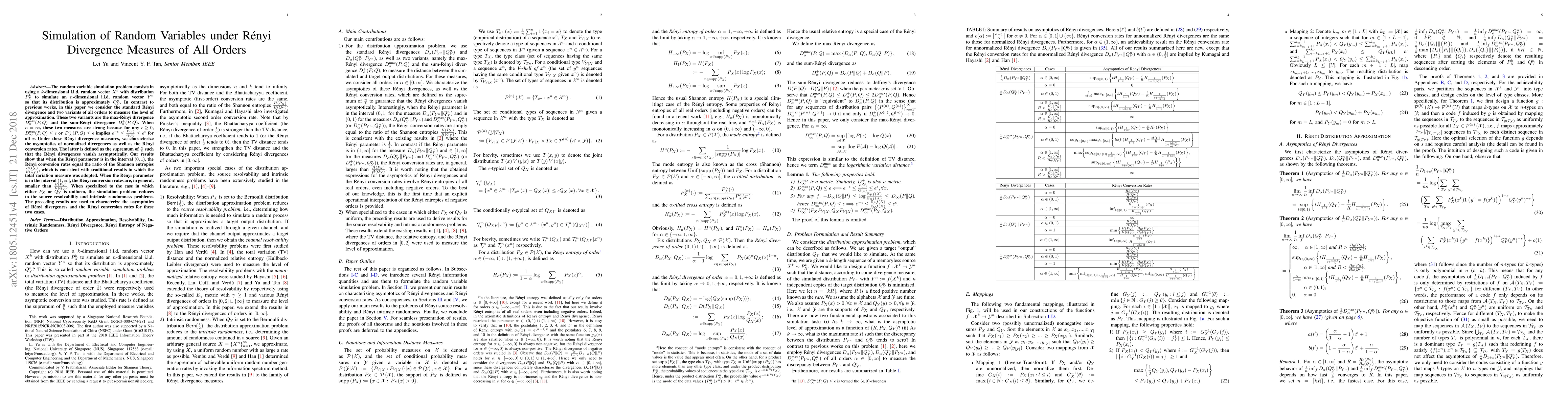 The random variable simulation problem consists in using a $k$-dimensional i.i.d. random vector $X^{k}$ with distribution $P_{X}^{k}$ to simulate an $n$-dimensional i.i.d. random vector $Y^{n}$ so that its distribution is approximately $Q_{Y}^{n}$. In contrast to previous works, in this paper we consider the standard R\'enyi divergence and two variants of all orders to measure the level of approximation. These two variants are the max-R\'enyi divergence $D_{\alpha}^{\mathsf{max}}(P,Q)$ and the sum-R\'enyi divergence $D_{\alpha}^{+}(P,Q)$. When $\alpha=\infty$, these two measures are strong because for any $\epsilon>0$, $D_{\infty}^{\mathsf{max}}(P,Q)\leq\epsilon$ or $D_{\infty}^{+}(P,Q)\leq\epsilon$ implies $e^{-\epsilon}\leq\frac{P(x)}{Q(x)}\leq e^{\epsilon}$ for all $x$. Under these R\'enyi divergence measures, we characterize the asymptotics of normalized divergences as well as the R\'enyi conversion rates. The latter is defined as the supremum of $\frac{n}{k}$ such that the R\'enyi divergences vanish asymptotically. In addition, when the R\'enyi parameter is in the interval $(0,1)$, the R\'enyi conversion rates equal the ratio of the Shannon entropies $\frac{H\left(P_{X}\right)}{H\left(Q_{Y}\right)}$, which is consistent with traditional results in which the total variation measure was adopted. When the R\'enyi parameter is in the interval $(1,\infty]$, the R\'enyi conversion rates are, in general, smaller than $\frac{H\left(P_{X}\right)}{H\left(Q_{Y}\right)}$. When specialized to the case in which either $P_{X}$ or $Q_{Y}$ is uniform, the simulation problem reduces to the source resolvability and intrinsic randomness problems. The preceding results are used to characterize the asymptotics of R\'enyi divergences and the R\'enyi conversion rates for these two cases.