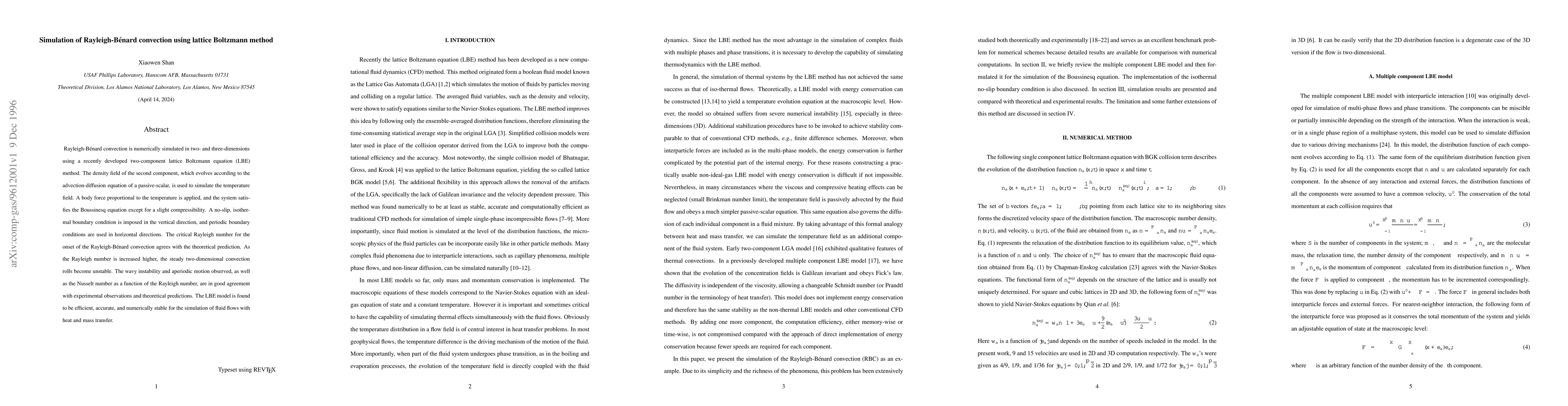 This paper simulates Rayleigh-Bénard convection in two and three dimensions using a lattice Boltzmann method, accurately reproducing the onset and instability of convection rolls and aligning with theoretical and experimental observations. The method proves efficient and stable for simulating fluid flows with heat and mass transfer.