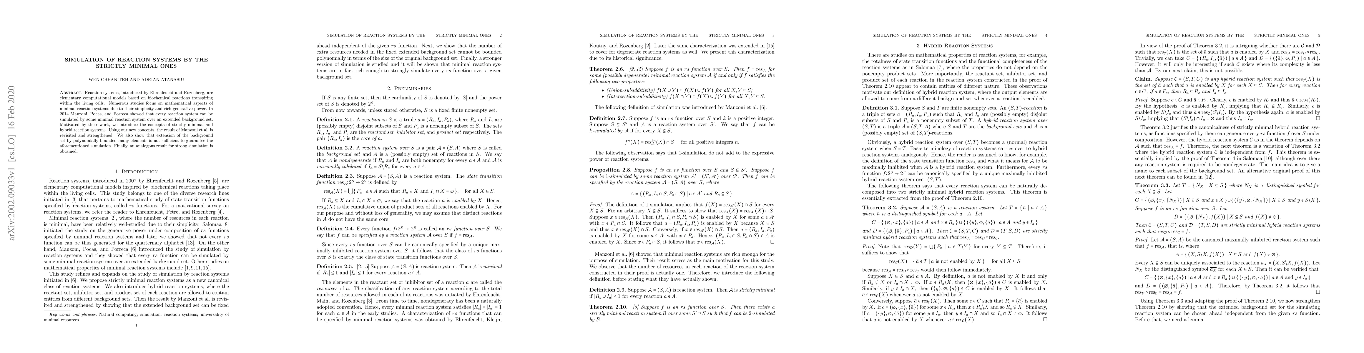 Reaction systems, introduced by Ehrenfeucht and Rozenberg, are elementary computational models based on biochemical reactions transpiring within the living cells. Numerous studies focus on mathematical aspects of minimal reaction systems due to their simplicity and rich generative power. In 2014 Manzoni, Pocas, and Porreca showed that every reaction system can be simulated by some minimal reaction system over an extended background set. Motivated by their work, we introduce the concepts of strictly minimal and hybrid reaction systems. Using our new concepts, the result of Manzoni et al. is revisited and strengthened. We also show that extension of the background set by polynomially bounded many elements is not sufficient to guarantee the aforementioned simulation. Finally, an analogous result for strong simulation is obtained.