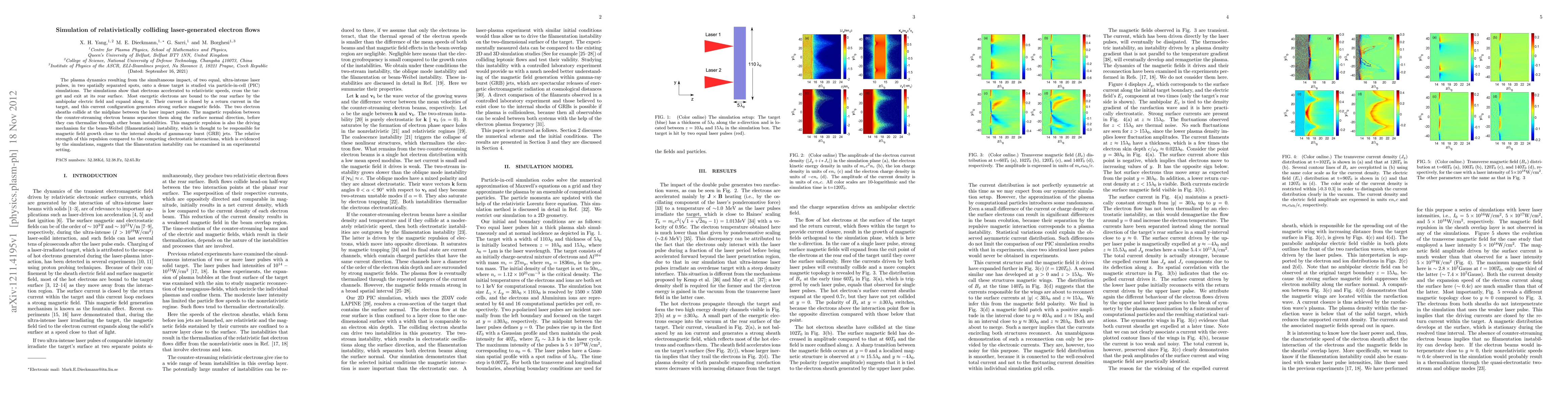 The plasma dynamics resulting from the simultaneous impact, of two equal, ultra-intense laser pulses, in two spatially separated spots, onto a dense target is studied via particle-in-cell (PIC) simulations. The simulations show that electrons accelerated to relativistic speeds, cross the target and exit at its rear surface. Most energetic electrons are bound to the rear surface by the ambipolar electric field and expand along it. Their current is closed by a return current in the target, and this current configuration generates strong surface magnetic fields. The two electron sheaths collide at the midplane between the laser impact points. The magnetic repulsion between the counter-streaming electron beams separates them along the surface normal direction, before they can thermalize through other beam instabilities. This magnetic repulsion is also the driving mechanism for the beam-Weibel (filamentation) instability, which is thought to be responsible for magnetic field growth close to the internal shocks of gamma-ray burst (GRB) jets. The relative strength of this repulsion compared to the competing electrostatic interactions, which is evidenced by the simulations, suggests that the filamentation instability can be examined in an experimental setting.