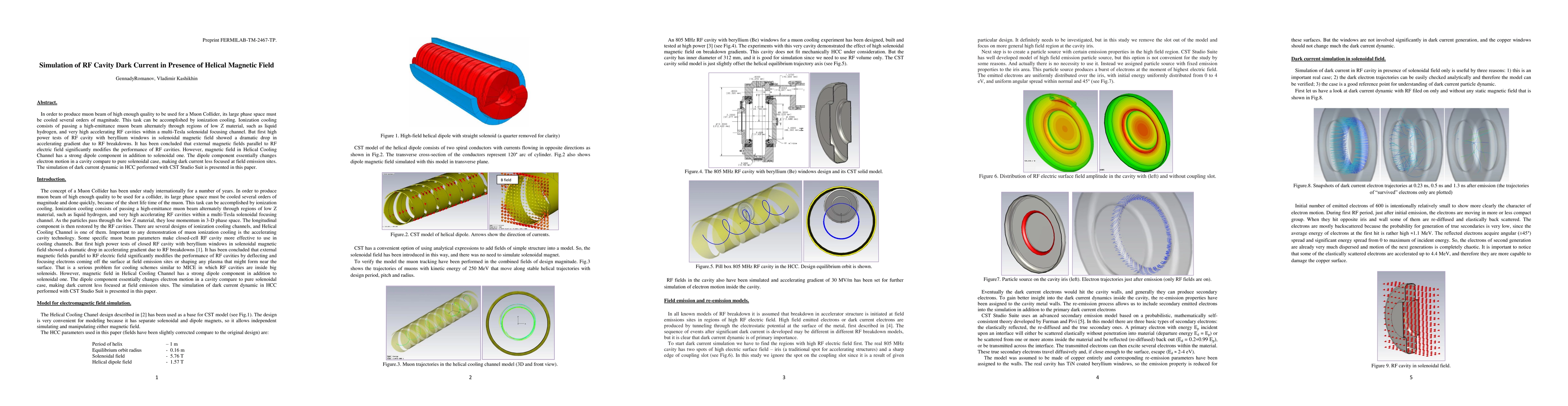 In order to produce muon beam of high enough quality to be used for a Muon Collider, its large phase space must be cooled several orders of magnitude. This task can be accomplished by ionization cooling. Ionization cooling consists of passing a high-emittance muon beam alternately through regions of low Z material, such as liquid hydrogen, and very high accelerating RF cavities within a multi-Tesla solenoidal focusing channel. But first high power tests of RF cavity with beryllium windows in solenoidal magnetic field showed a dramatic drop in accelerating gradient due to RF breakdowns. It has been concluded that external magnetic fields parallel to RF electric field significantly modifies the performance of RF cavities. However, magnetic field in Helical Cooling Channel has a strong dipole component in addition to solenoidal one. The dipole component essentially changes electron motion in a cavity compare to pure solenoidal case, making dark current less focused at field emission sites. The simulation of dark current dynamic in HCC performed with CST Studio Suit is presented in this paper.