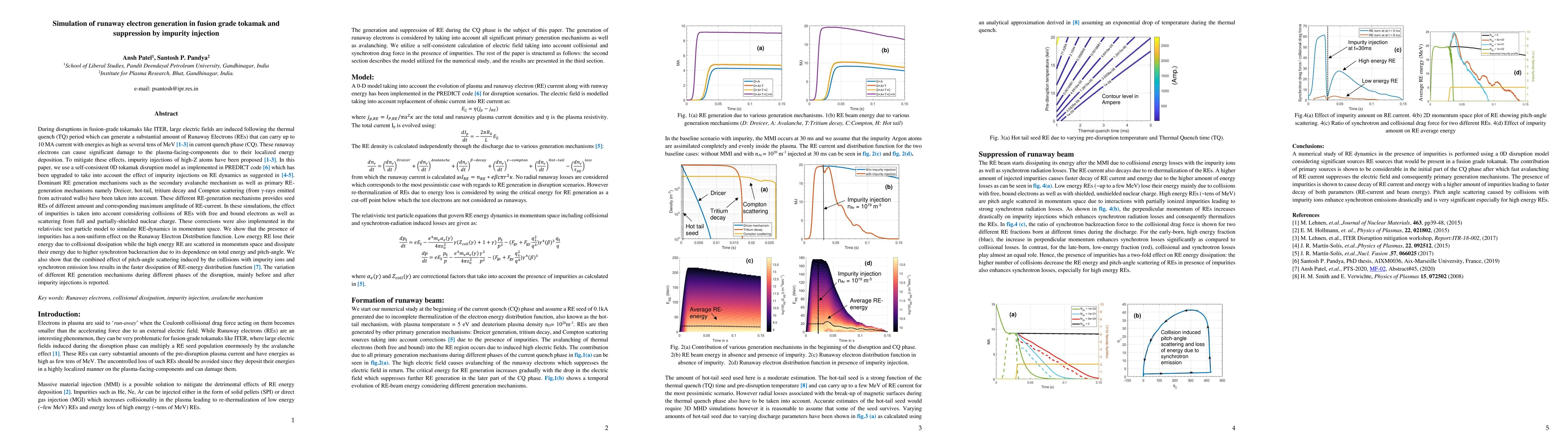 During disruptions in fusion-grade tokamaks like ITER, large electric fields are induced following the thermal quench (TQ) period which can generate a substantial amount of Runaway Electrons (REs) that can carry up to 10 MA current with energies as high as several tens of MeV [1-3] in current quench phase (CQ). These runaway electrons can cause significant damage to the plasma-facing-components due to their localized energy deposition. To mitigate these effects, impurity injections of high-Z atoms have been proposed [1-3]. In this paper, we use a self-consistent 0D tokamak disruption model as implemented in PREDICT code [6] which has been upgraded to take into account the effect of impurity injections on RE dynamics as suggested in [4-5]. Dominant RE generation mechanisms such as the secondary avalanche mechanism as well as primary RE-generation mechanisms namely Dreicer, hot-tail, tritium decay and Compton scattering (from {\gamma}-rays emitted from activated walls) have been taken into account. In these simulations, the effect of impurities is taken into account considering collisions of REs with free and bound electrons as well as scattering from full and partially-shielded nuclear charge. These corrections were also implemented in the relativistic test particle model to simulate RE-dynamics in momentum space. We show that the presence of impurities has a non-uniform effect on the Runaway Electron Distribution function. We also show that the combined effect of pitch-angle scattering induced by the collisions with impurity ions and synchrotron emission loss results in the faster dissipation of RE-energy distribution function [7]. The variation of different RE generation mechanisms during different phases of the disruption, mainly before and after impurity injections is reported.