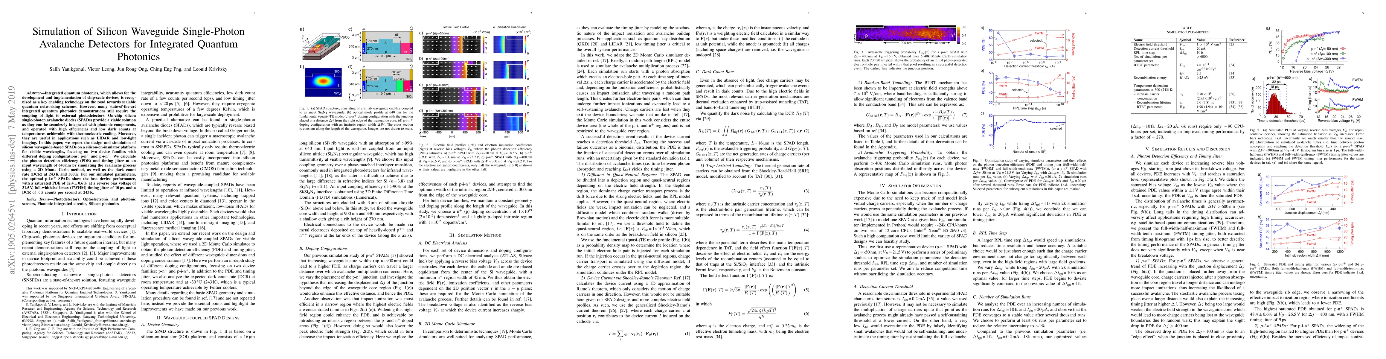 This paper details the design and simulation of silicon waveguide-based single-photon avalanche diodes (SPADs) for integrated quantum photonics, focusing on two doping configurations. Simulation results show optimal p-i-n+ SPADs achieve a saturated photon detection efficiency of 52.4% with minimal timing jitter and dark counts.