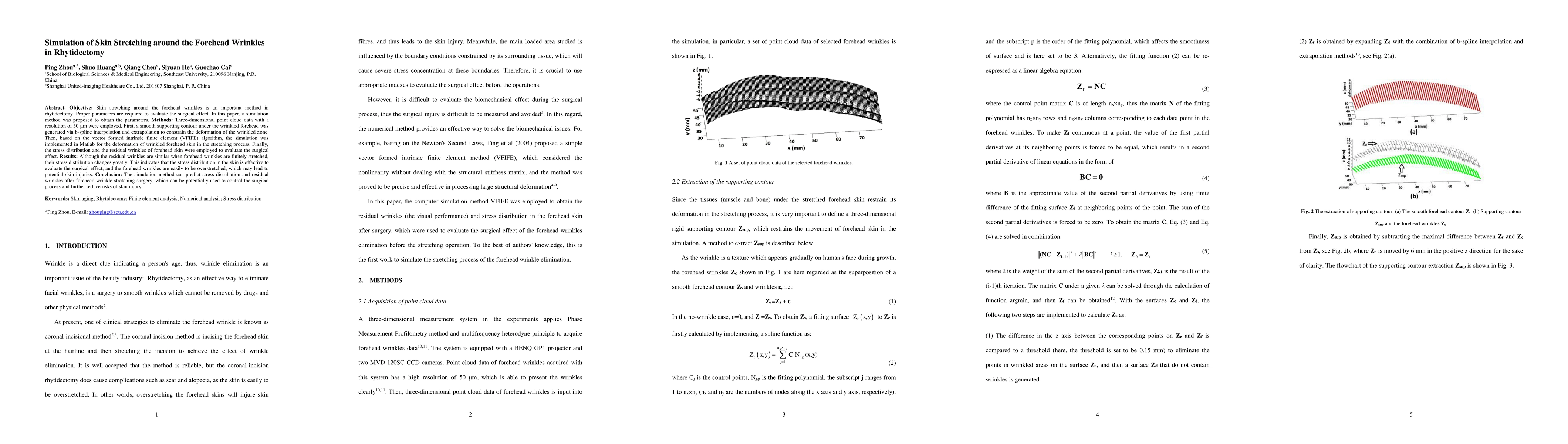 A simulation method was developed to evaluate the surgical effect of forehead wrinkle stretching in rhytidectomy, finding that stress distribution is a key indicator of surgical success, while residual wrinkles can be easily overstretched.