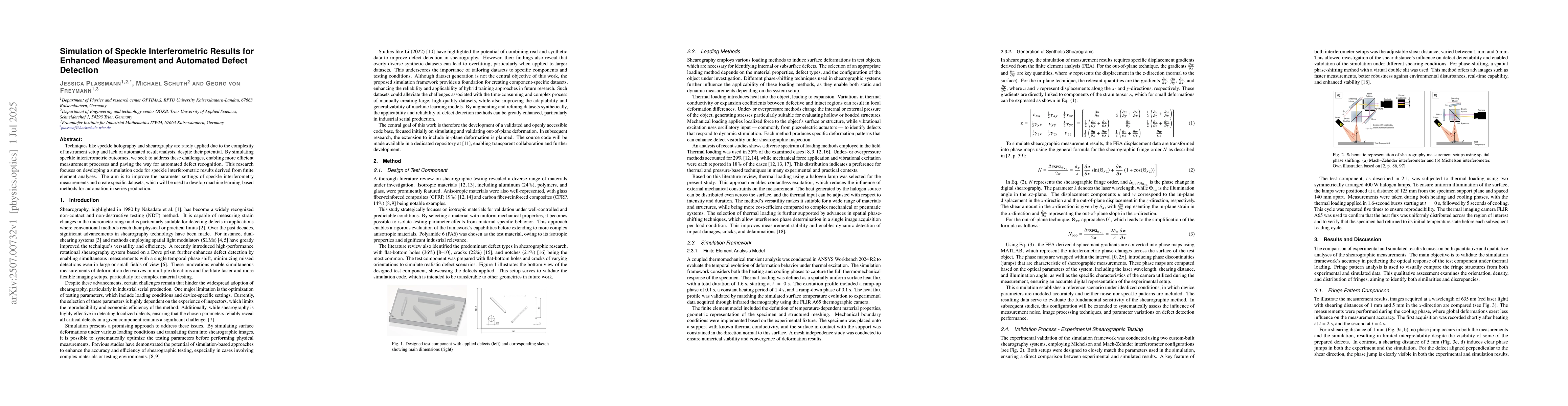 Techniques like speckle holography and shearography are rarely applied due to the complexity of instrument setup and lack of automated result analysis, despite their potential. By simulating speckle interferometric outcomes, we seek to address these challenges, enabling more efficient measurement processes and paving the way for automated defect recognition. This research focuses on developing a simulation code for speckle interferometric results derived from finite element analyses. The aim is to improve the parameter settings of speckle interferometry measurements and create specific datasets, which will be used to develop machine learning-based methods for automation in series production.