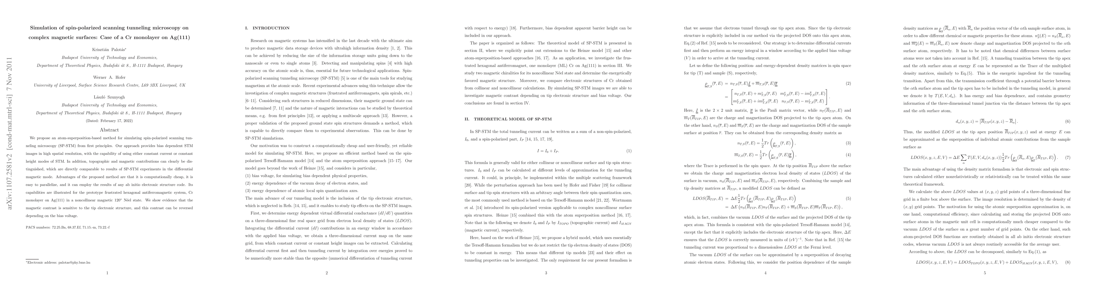 This paper proposes an efficient atom-superposition method for simulating spin-polarized scanning tunneling microscopy on complex magnetic surfaces, demonstrating its application on a Cr monolayer on Ag(111). The method distinguishes magnetic and topographic features and shows bias-dependent magnetic contrast sensitivity.