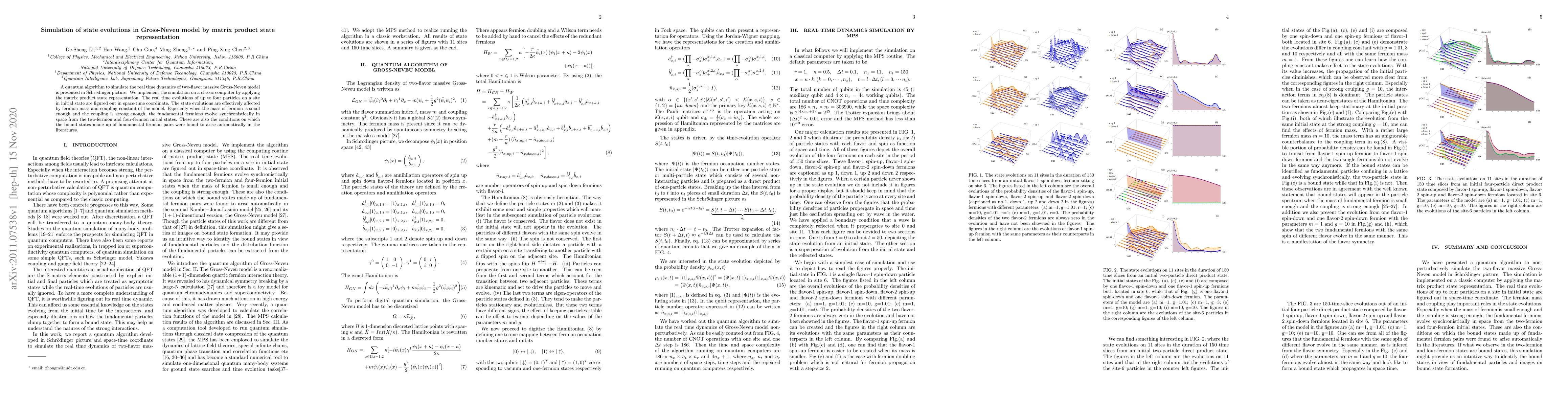 A quantum algorithm simulates the dynamics of a Gross-Neveu model with up to four particles, showing synchronized evolution under certain conditions that lead to bound states.
