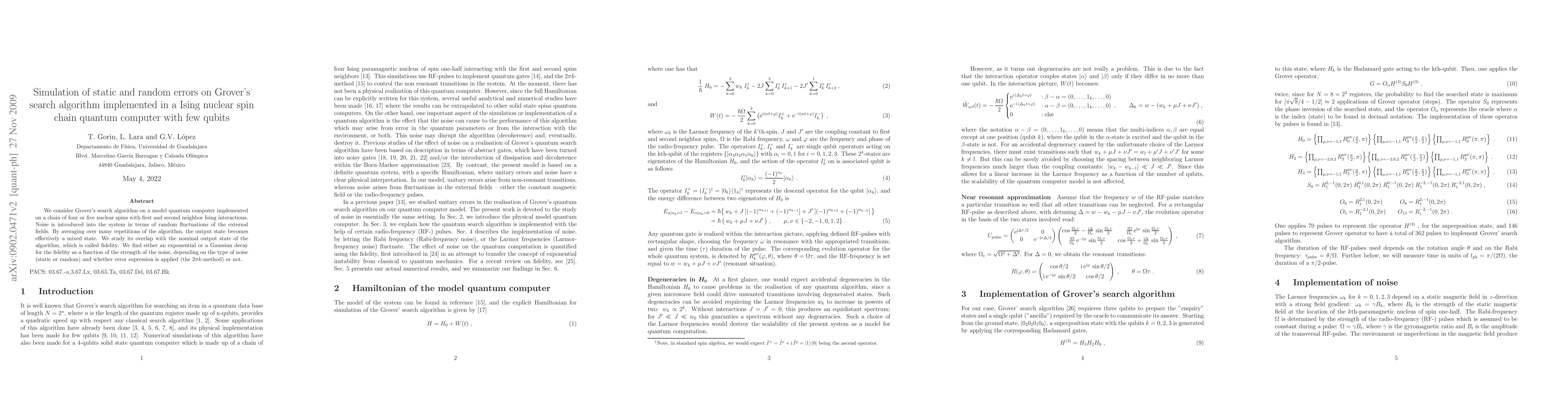 This paper investigates the impact of static and random errors on Grover's search algorithm implemented in a small Ising nuclear spin chain quantum computer. It finds that the fidelity of the algorithm's output decays exponentially or Gaussianly based on the noise type and error suppression methods used.