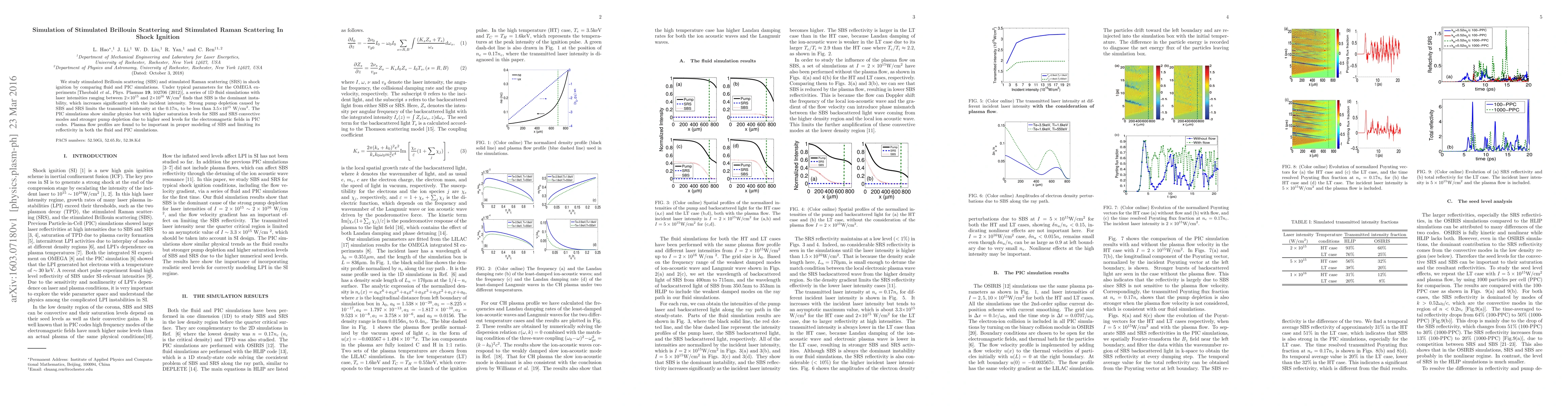 This paper compares fluid and PIC simulations to study stimulated Brillouin scattering (SBS) and stimulated Raman scattering (SRS) in shock ignition, finding SBS to be the dominant instability that limits transmitted laser intensity. PIC simulations show higher saturation levels and stronger pump depletion due to electromagnetic field seed levels.