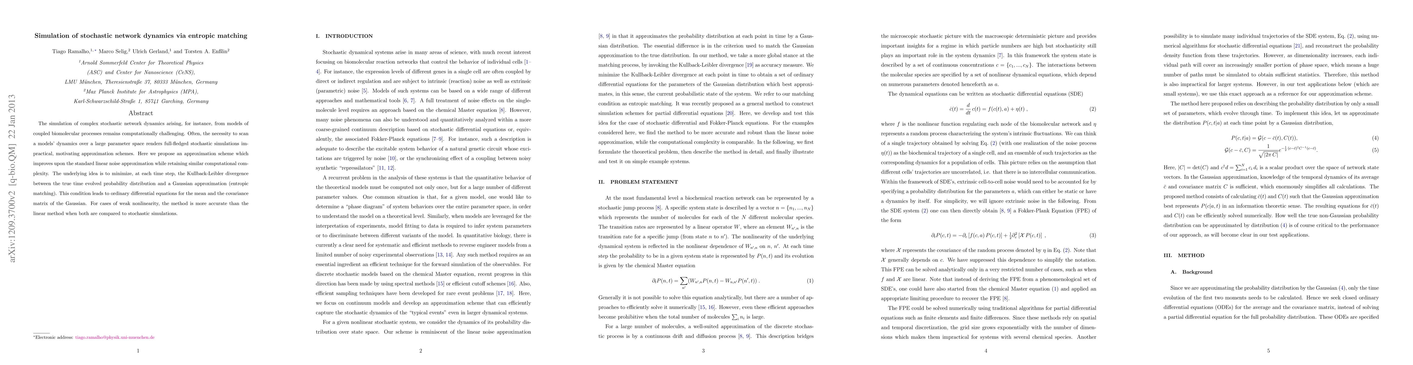 This paper proposes an approximation scheme for simulating stochastic network dynamics, improving upon the linear noise approximation by minimizing the Kullback-Leibler divergence through entropic matching, resulting in ordinary differential equations for the mean and covariance matrix of Gaussian approximations. The method shows greater accuracy than the linear method for weakly nonlinear systems.