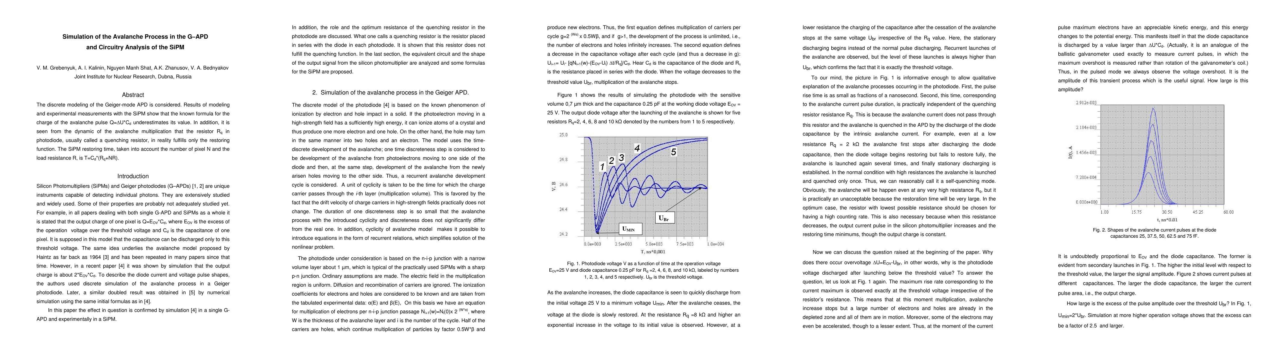 The paper presents a discrete model of Geiger-mode APDs, finding that the traditional avalanche pulse charge formula underestimates its value. Experiments with SiPM reveal the quenching resistor primarily restores function, not quenching, with restoring time T=Cd*(Rq+NR).