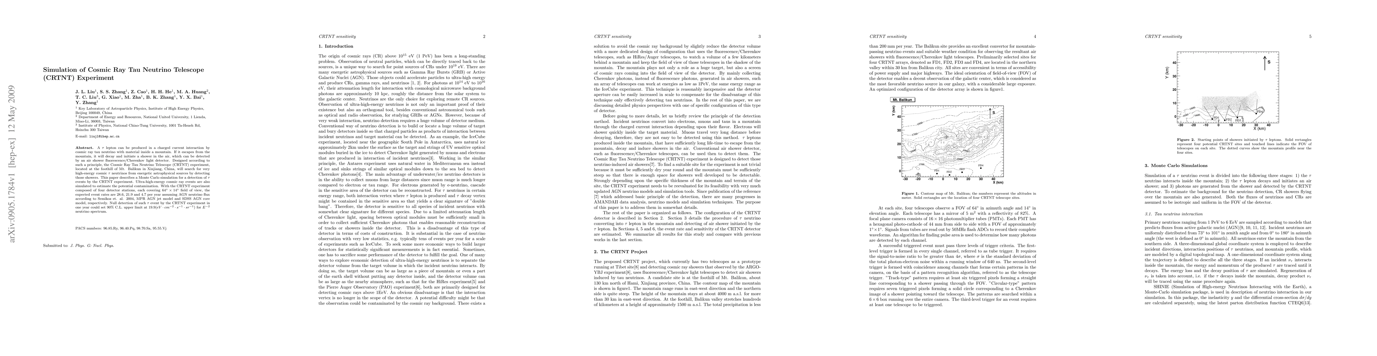 A tau lepton can be produced in a charged current interaction by cosmic ray tau neutrino with material inside a mountain. If it escapes from the mountain, it will decay and initiate a shower in the air, which can be detected by an air shower fluorescence/Cherenkov light detector. Designed according to such a principle, the Cosmic Ray Tau Neutrino Telescope (CRTNT) experiment, located at the foothill of Mt. Balikun in Xinjiang, China, will search for very high-energy cosmic tau neutrinos from energetic astrophysical sources by detecting those showers. This paper describes a Monte Carlo simulation for a detection of tau neutrino events by the CRTNT experiment. Ultra-high-energy cosmic ray events are also simulated to estimate the potential contamination. With the CRTNT experiment composed of four detector stations, each covering 64 by 14 degrees field of view, the expected event rates are 28.6, 21.9 and 4.7 per year assuming AGN neutrino flux according to Semikoz et. al. 2004, MPR AGN jet model and SDSS AGN core model, respectively. Null detection of such tau event by the CRTNT experiment in one year could set 90% C.L. upper limit at 19.9 (eV^-1 cm^-2 s^-1 sr^-1) for E^-2 neutrino spectrum.