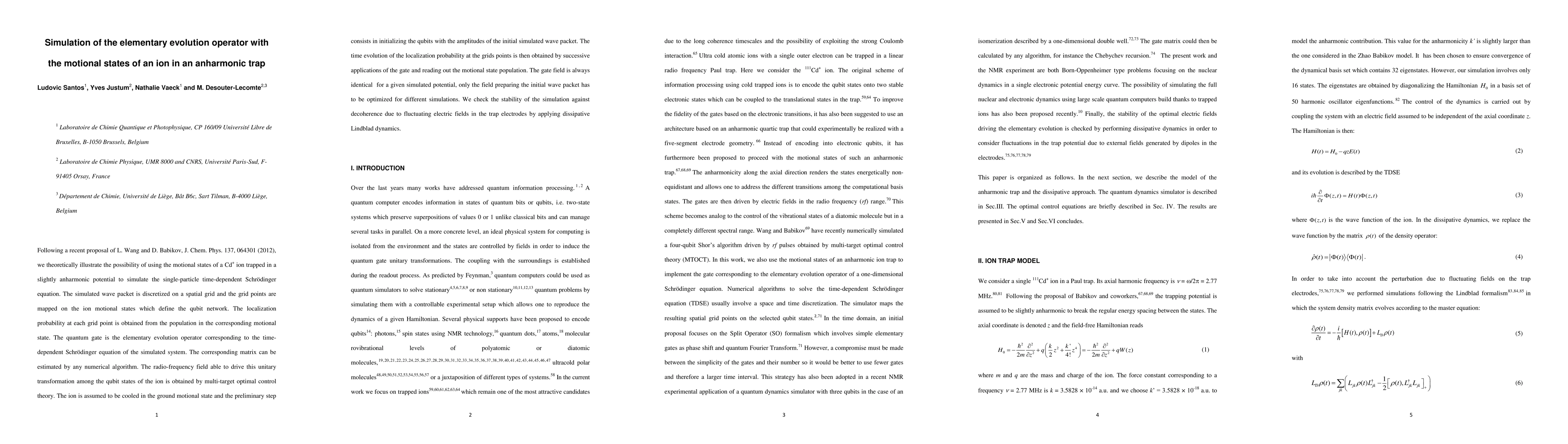 Following a recent proposal of L. Wang and D. Babikov, J. Chem. Phys. 137, 064301 (2012), we theoretically illustrate the possibility of using the motional states of a $Cd^+$ ion trapped in a slightly anharmonic potential to simulate the single-particle time-dependent Schr\"odinger equation. The simulated wave packet is discretized on a spatial grid and the grid points are mapped on the ion motional states which define the qubit network. The localization probability at each grid point is obtained from the population in the corresponding motional state. The quantum gate is the elementary evolution operator corresponding to the time-dependent Schr\"odinger equation of the simulated system. The corresponding matrix can be estimated by any numerical algorithm. The radio-frequency field able to drive this unitary transformation among the qubit states of the ion is obtained by multi-target optimal control theory. The ion is assumed to be cooled in the ground motional state and the preliminary step consists in initializing the qubits with the amplitudes of the initial simulated wave packet. The time evolution of the localization probability at the grids points is then obtained by successive applications of the gate and reading out the motional state population. The gate field is always identical for a given simulated potential, only the field preparing the initial wave packet has to be optimized for different simulations. We check the stability of the simulation against decoherence due to fluctuating electric fields in the trap electrodes by applying dissipative Lindblad dynamics.