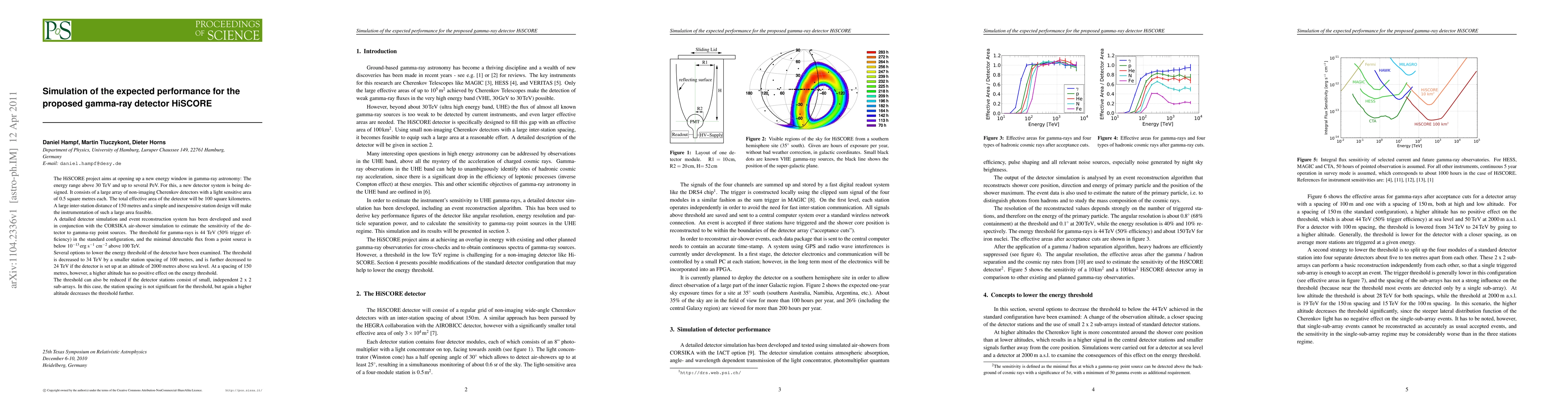The HiSCORE project aims at opening up a new energy window in gamma-ray astronomy: The energy range above 30 TeV and up to several PeV. For this, a new detector system is being designed. It consists of a large array of non-imaging Cherenkov detectors with a light sensitive area of 0.5 square metres each. The total effective area of the detector will be 100 square kilometres. A large inter-station distance of 150 metres and a simple and inexpensive station design will make the instrumentation of such a large area feasible. A detailed detector simulation and event reconstruction system has been developed and used in conjunction with the CORSIKA air-shower simulation to estimate the sensitivity of the detector to gamma-ray point sources. The threshold for gamma-rays is 44 TeV (50% trigger efficiency) in the standard configuration, and the minimal detectable flux from a point source is below 10^(-13) erg / (s cm^2) above 100 TeV. Several options to lower the energy threshold of the detector have been examined. The threshold is decreased to 34 TeV by a smaller station spacing of 100 metres, and is further decreased to 24 TeV if the detector is set up at an altitude of 2000 metres above sea level. At a spacing of 150 metres, however, a higher altitude has no positive effect on the energy threshold. The threshold can also be reduced if the detector stations consist of small, independent 2 x 2 sub-arrays. In this case, the station spacing is not significant for the threshold, but again a higher altitude decreases the threshold further.