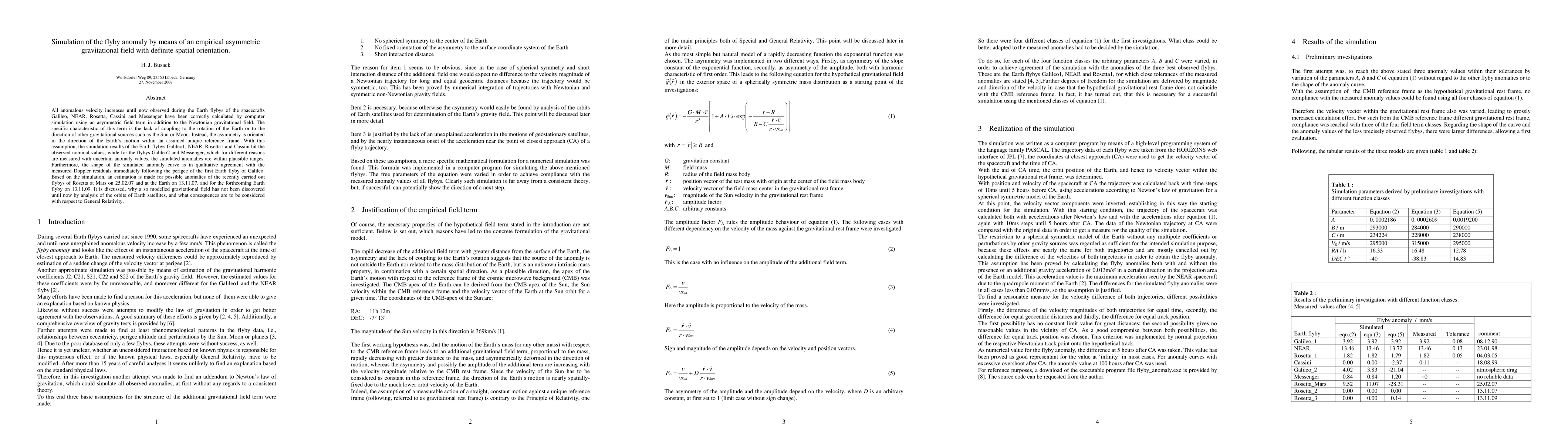 All anomalous velocity increases until now observed during the Earth flybys of the spacecrafts Galileo, NEAR, Rosetta, Cassini and Messenger have been correctly calculated by computer simulation using an asymmetric field term in addition to the Newtonian gravitational field. The specific characteristic of this term is the lack of coupling to the rotation of the Earth or to the direction of other gravitational sources such as the Sun or Moon. Instead, the asymmetry is oriented in the direction of the Earth's motion within an assumed unique reference frame. With this assumption, the simulation results of the Earth flybys Galileo1, NEAR, Rosetta1 and Cassini hit the observed nominal values, while for the flybys Galileo2 and Messenger, which for different reasons are measured with uncertain anomaly values, the simulated anomalies are within plausible ranges. Furthermore, the shape of the simulated anomaly curve is in qualitative agreement with the measured Doppler residuals immediately following the perigee of the first Earth flyby of Galileo. Based on the simulation, an estimation is made for possible anomalies of the recently carried out flybys of Rosetta at Mars on 25.02.07 and at the Earth on 13.11.07, and for the forthcoming Earth flyby on 13.11.09. It is discussed, why a so modelled gravitational field has not been discovered until now by analysis of the orbits of Earth satellites, and what consequences are to be considered with respect to General Relativity.