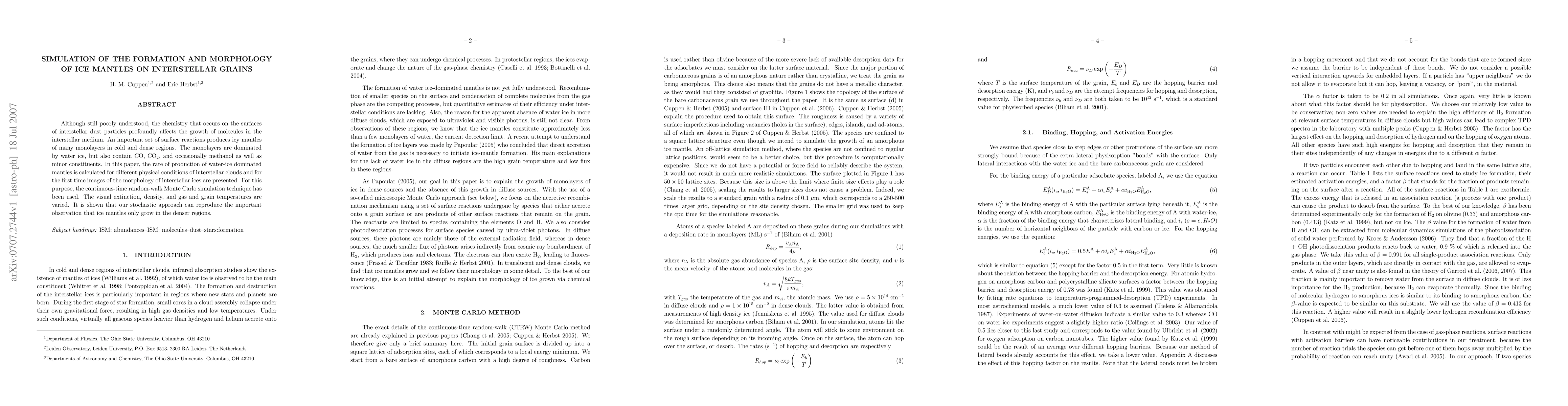 This paper uses a Monte Carlo simulation to model the formation and morphology of water-ice dominated mantles on interstellar dust grains, revealing that ice growth is favored in denser regions. The study provides the first images of interstellar ice morphology and highlights the impact of varying physical conditions on ice mantle production.