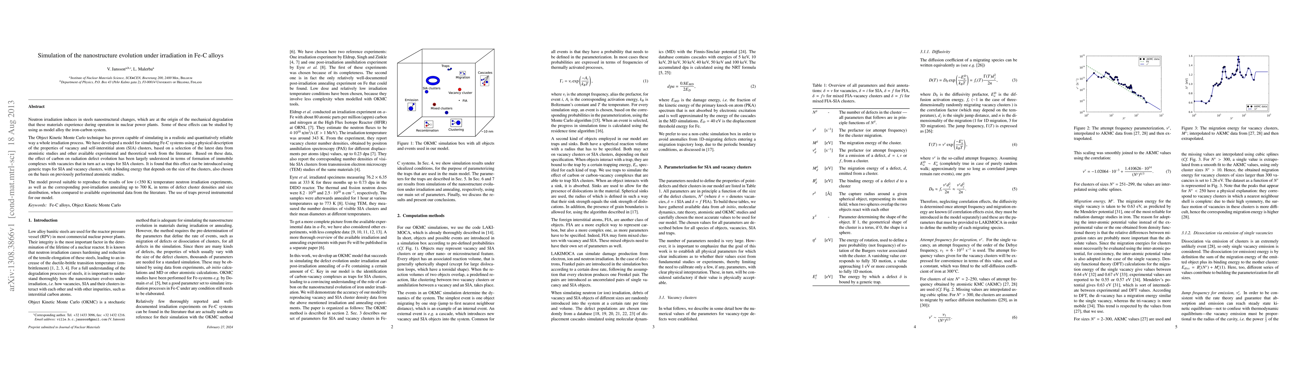 This paper develops a model using the Object Kinetic Monte Carlo technique to simulate the nanostructure evolution in Fe-C alloys under neutron irradiation, focusing on the formation of vacancy and self-interstitial atom clusters. The model successfully reproduces experimental results for defect cluster densities and size distribution during irradiation and post-irradiation annealing.