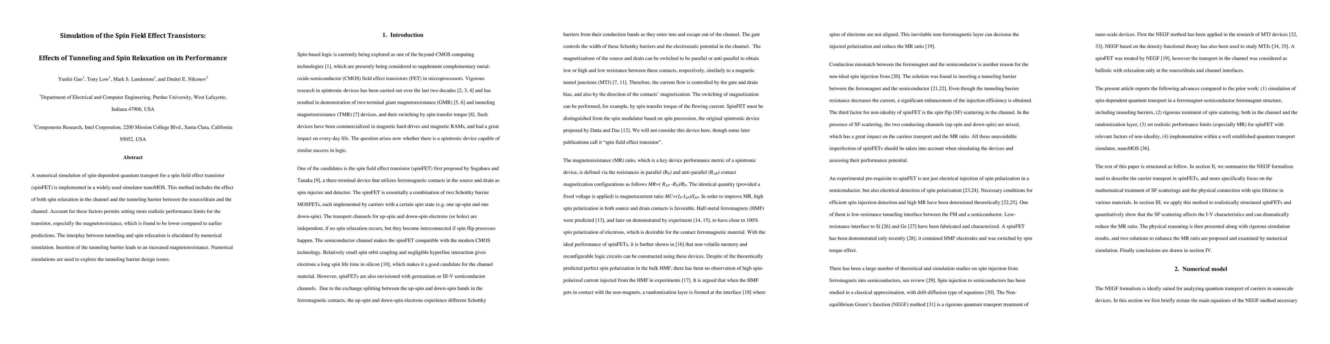 A numerical simulation of spin-dependent quantum transport for a spin field effect transistor (spinFET) is implemented in a widely used simulator nanoMOS. This method includes the effect of both spin relaxation in the channel and the tunneling barrier between the source/drain and the channel. Account for these factors permits setting more realistic performance limits for the transistor, especially the magnetoresistance, which is found to be lower compared to earlier predictions. The interplay between tunneling and spin relaxation is elucidated by numerical simulation. Insertion of the tunneling barrier leads to an increased magnetoresistance. Numerical simulations are used to explore the tunneling barrier design issues.