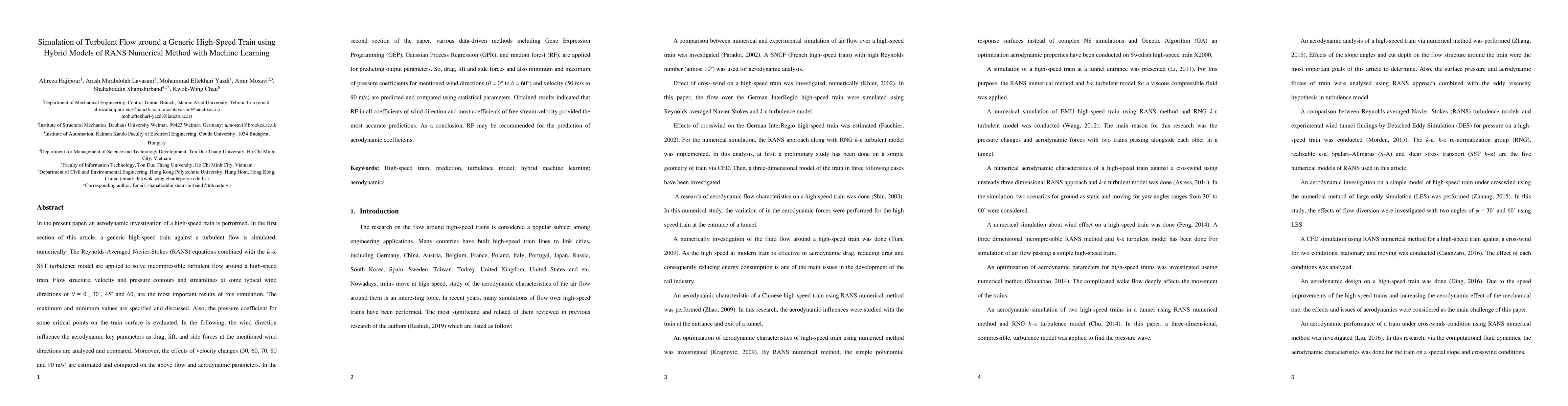 This paper simulates turbulent flow around a high-speed train using RANS equations and analyzes aerodynamic parameters like drag, lift, and side forces. It also employs machine learning methods, specifically random forest, to predict these parameters, finding it to be the most accurate.