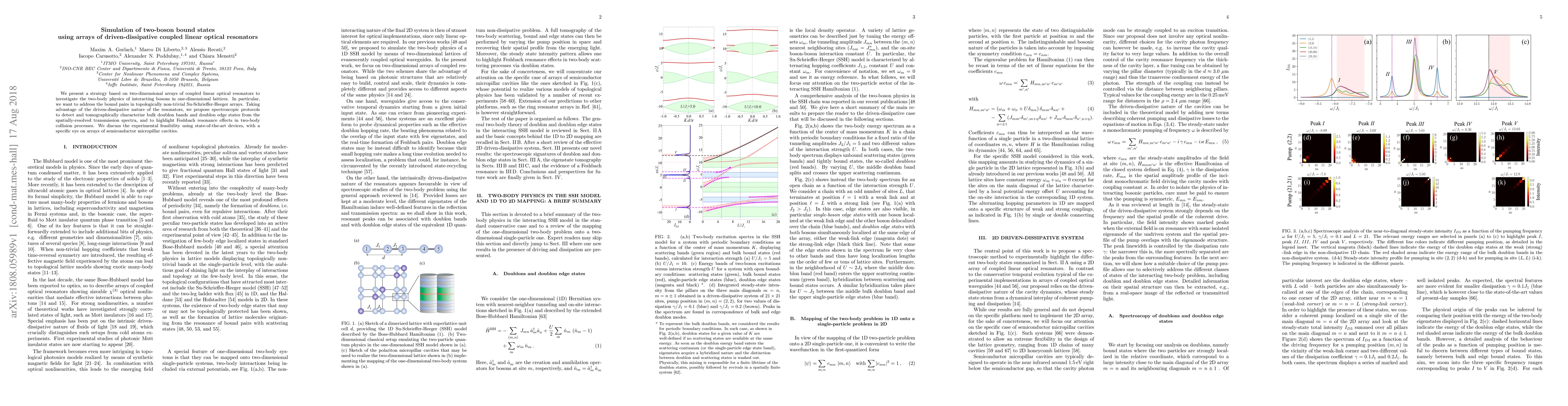 This paper proposes using arrays of driven-dissipative coupled linear optical resonators to simulate two-boson bound states, focusing on topologically non-trivial Su-Schrieffer-Heeger lattices. It outlines spectroscopic methods to detect and characterize doublon bands and edge states, and discusses the experimental feasibility using semiconductor micropillar cavities.