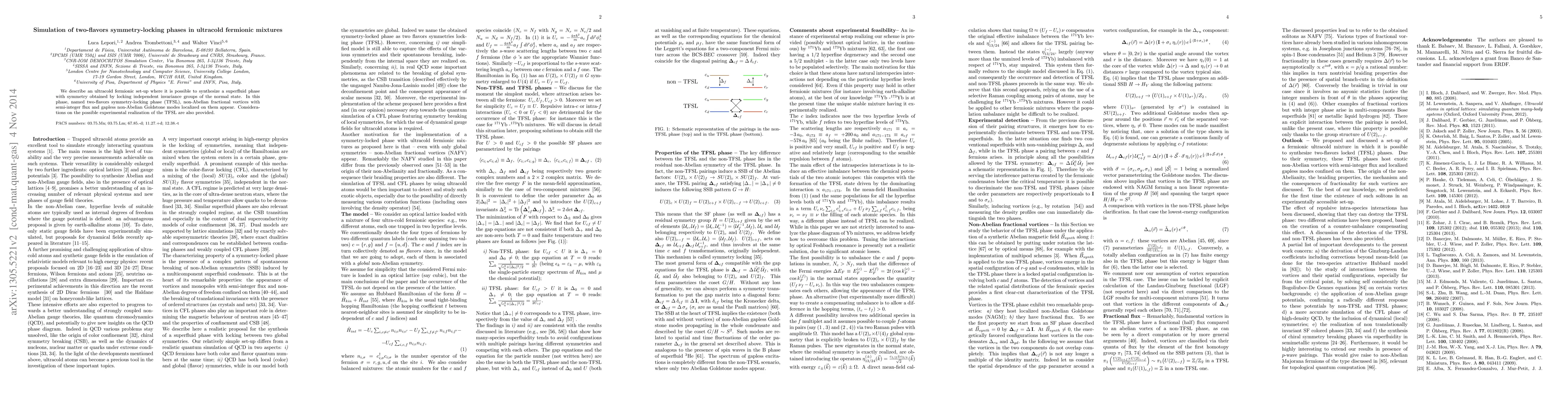 We describe an ultracold fermionic set-up where it is possible to synthesize a superfluid phase with symmetry obtained by locking independent invariance groups of the normal state. In this phase, named two-flavors symmetry-locking phase (TFSL), non-Abelian fractional vortices with semi-integer flux and gapless non-Abelian Goldstone modes localized on them appear. Considerations on the possible experimental realization of the TFSL are also provided.