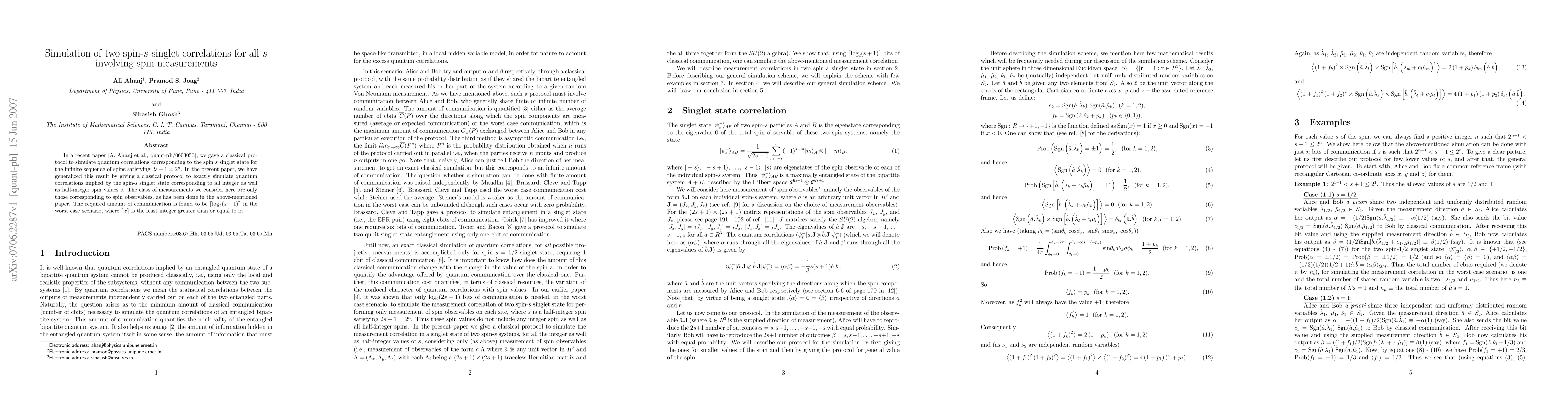 In a recent paper [A. Ahanj et al., quant-ph/0603053], we gave a classical protocol to simulate quantum correlations corresponding to the spin $s$ singlet state for the infinite sequence of spins satisfying $2s+1 = 2^{n}$. In the present paper, we have generalized this result by giving a classical protocol to exactly simulate quantum correlations implied by the spin-$s$ singlet state corresponding to all integer as well as half-integer spin values $s$. The class of measurements we consider here are only those corresponding to spin observables, as has been done in the above-mentioned paper. The required amount of communication is found to be $\lceil {\rm log}_{2} (s + 1) \rceil$ in the worst case scenario, where $\lceil x \rceil$ is the least integer greater than or equal to $x$.