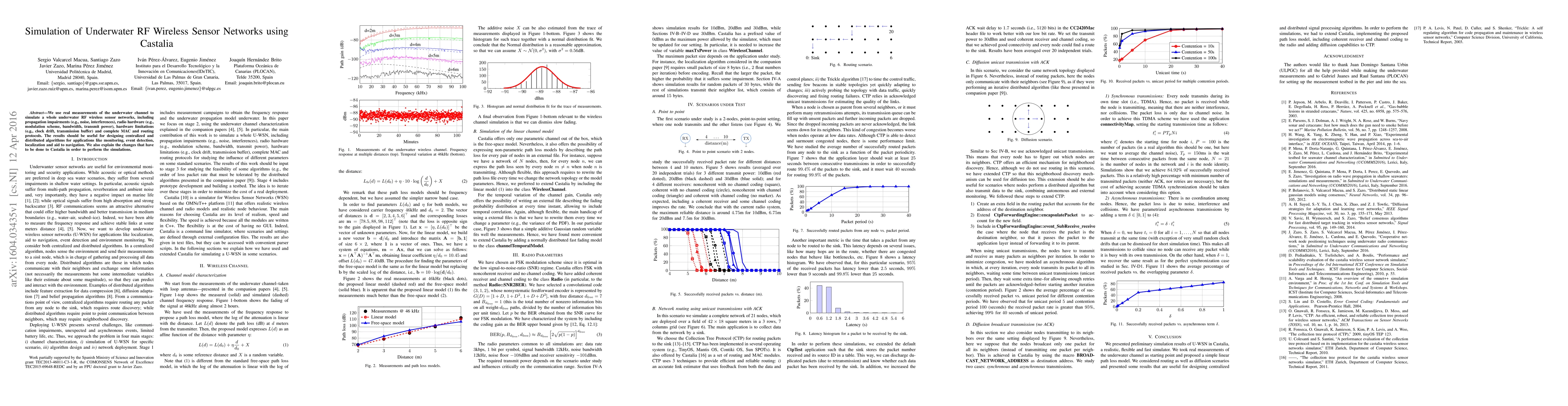 This paper simulates an underwater RF wireless sensor network using real channel measurements, incorporating propagation impairments, hardware limitations, and protocols. The results aim to assist in designing algorithms for monitoring, event detection, localization, and navigation, with modifications to Castalia detailed for the simulations.