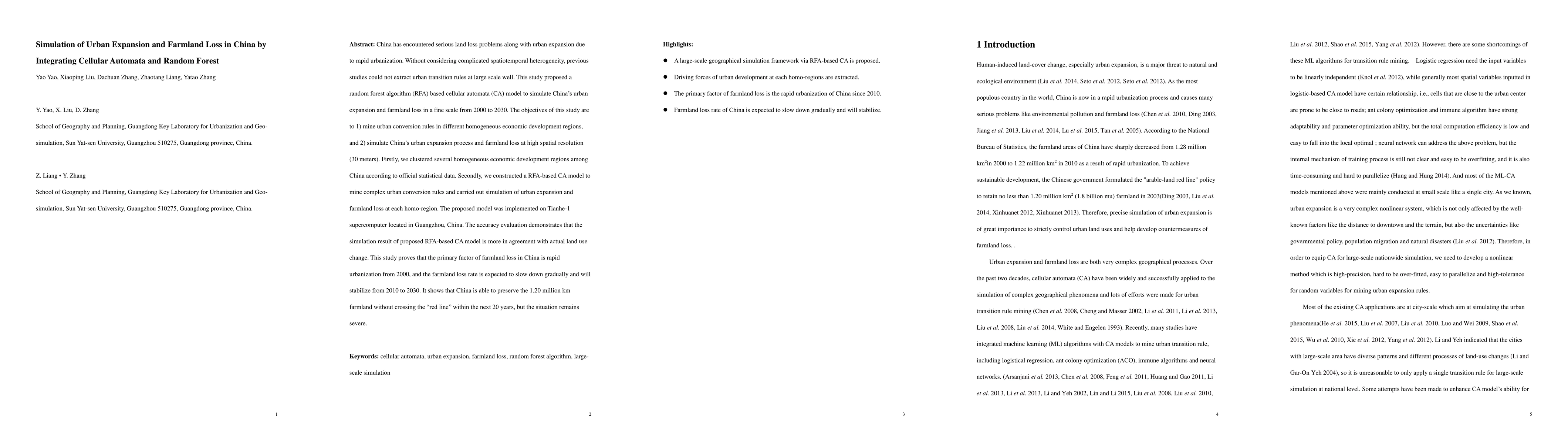 This study proposes a Random Forest Algorithm (RFA) based Cellular Automata (CA) model to simulate urban expansion and farmland loss in China from 2000 to 2030, achieving high spatial resolution. The model identifies urban conversion rules in different economic development regions and predicts a gradual stabilization of farmland loss due to urbanization.