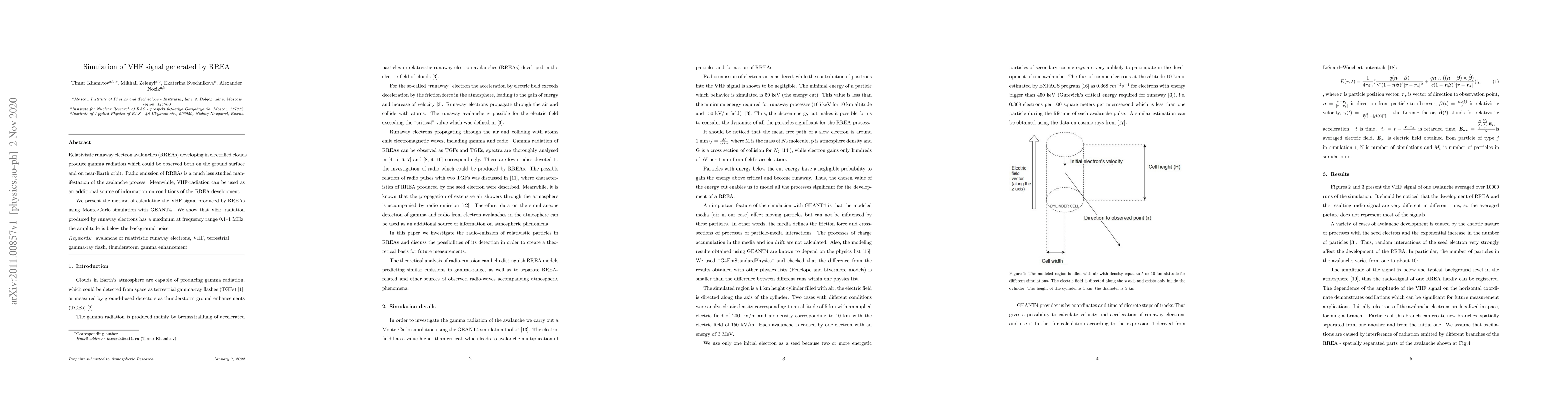 Relativistic runaway electron avalanches (RREAs) developing in electrified clouds produce gamma radiation which could be observed both on the ground surface and on near-Earth orbit. Radio emission of RREAs is a much less studied manifestation of the avalanche process. Meanwhile, VHF-radiation can be used as an additional source of information on conditions of the RREA development. We present the method of calculating the VHF signal produced by RREAs using Monte-Carlo simulation with GEANT4. We show that VHF radiation produced by runaway electrons has a maximum at frequency range 0.1--1 MHz, the amplitude is below the background noise.