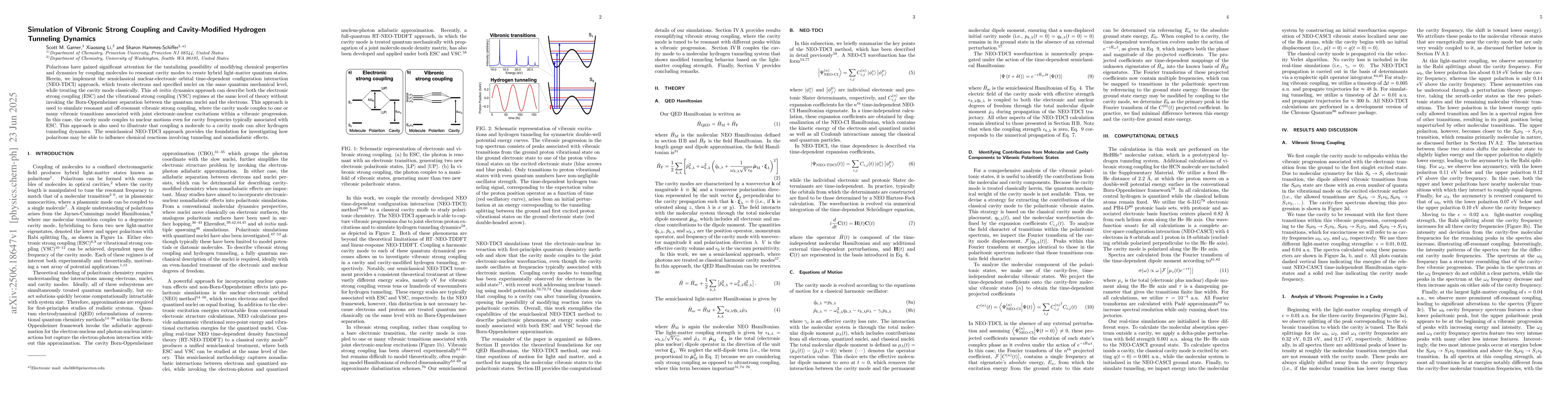 Polaritons have gained significant attention for the tantalizing possibility of modifying chemical properties and dynamics by coupling molecules to resonant cavity modes to create hybrid light-matter quantum states. Herein, we implement the semiclassical nuclear-electronic orbital time-dependent configuration interaction (NEO-TDCI) approach, which treats electrons and specified nuclei on the same quantum mechanical level, while treating the cavity mode classically. This ab initio dynamics approach can describe both the electronic strong coupling (ESC) and the vibrational strong coupling (VSC) regimes at the same level of theory without invoking the Born-Oppenheimer separation between the quantum nuclei and the electrons. This approach is used to simulate resonant and off-resonant vibronic strong coupling, where the cavity mode couples to one or many vibronic transitions associated with joint electronic-nuclear excitations within a vibronic progression. In this case, the cavity mode couples to nuclear motions even for cavity frequencies typically associated with ESC. This approach is also used to illustrate that coupling a molecule to a cavity mode can alter hydrogen tunneling dynamics. The semiclassical NEO-TDCI approach provides the foundation for investigating how polaritons may be able to influence chemical reactions involving tunneling and nonadiabatic effects.