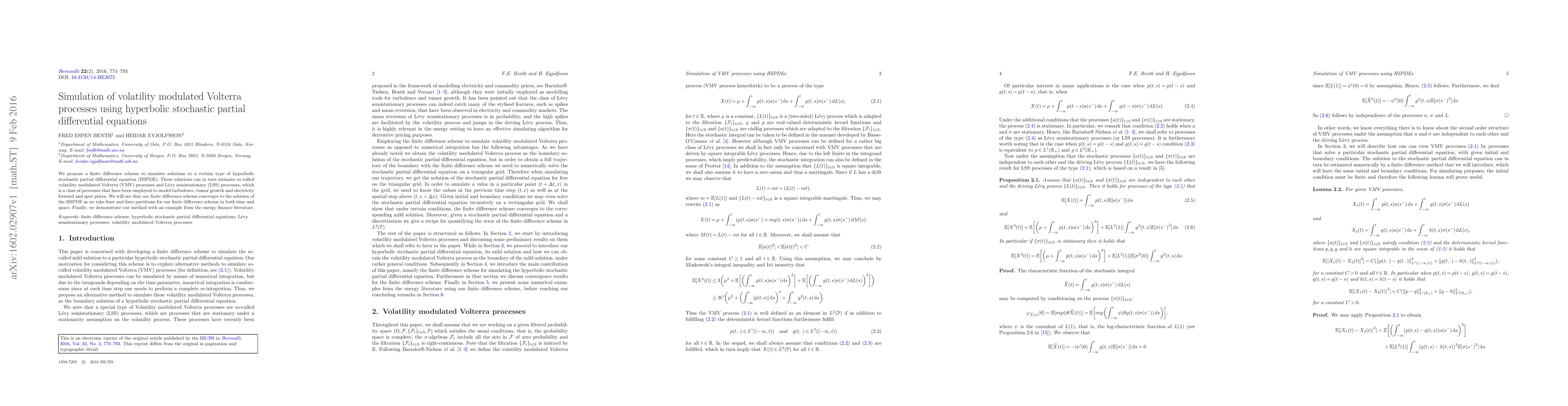 We propose a finite difference scheme to simulate solutions to a certain type of hyperbolic stochastic partial differential equation (HSPDE). These solutions can in turn estimate so called volatility modulated Volterra (VMV) processes and L\'{e}vy semistationary (LSS) processes, which is a class of processes that have been employed to model turbulence, tumor growth and electricity forward and spot prices. We will see that our finite difference scheme converges to the solution of the HSPDE as we take finer and finer partitions for our finite difference scheme in both time and space. Finally, we demonstrate our method with an example from the energy finance literature.