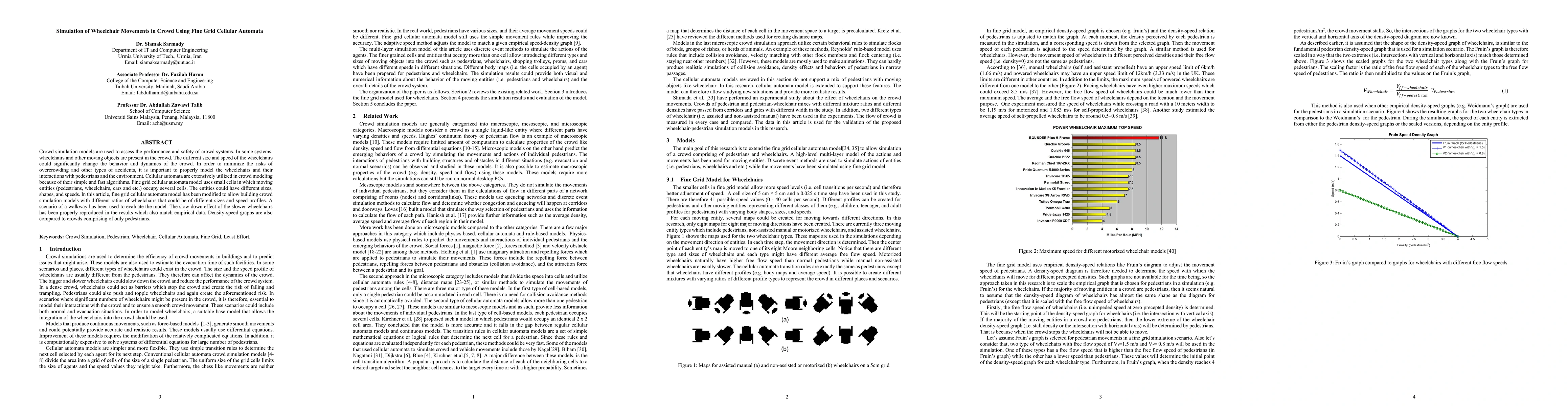 This paper modifies a fine grid cellular automata model to simulate wheelchair movements in crowds, allowing for different wheelchair sizes and speeds. The model's effectiveness is evaluated in a walkway scenario, demonstrating accurate reproduction of slower wheelchairs' impact on crowd dynamics and matching empirical data.
