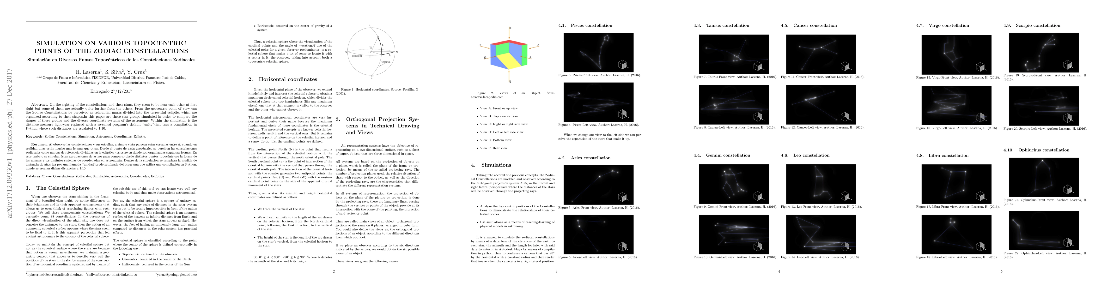 On the sighting of the constellations and their stars, they seem to be near each other at first sight but some of thema are actually quite further from the others. Froma the geocentric point view can the Zodiac Costellations be perceived as referential marks divided into terrestrial ecliptic, which are organized according to their shapes. In this paper are these star groups simulated in order to compare the shapes of these groups and the diverse coordinate system of the astronomy. Within the simulation is the distance measure light-year remplaced with a so-called program's default "unity" that uses a compilation in Python, where such distances are escalated to 1:10