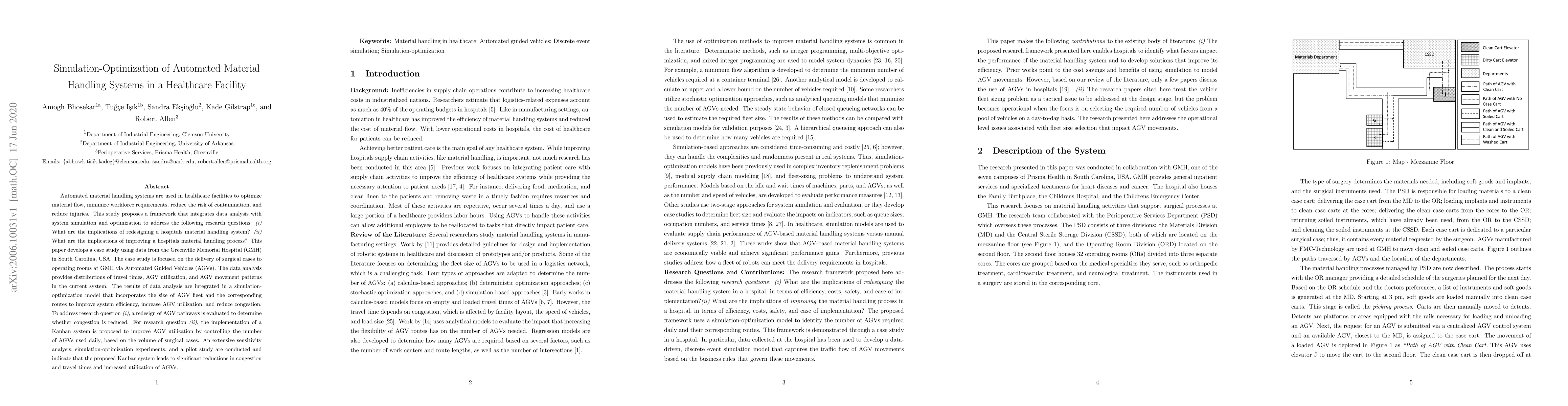 Automated material handling systems are used in healthcare facilities to optimize material flow, minimize workforce requirements, reduce the risk of contamination, and reduce injuries. This study proposes a framework that integrates data analysis with system simulation and optimization to address the following research questions: (i) What are the implications of redesigning a hospital's material handling system? (ii) What are the implications of improving a hospital's material handling process? This paper develops a case study using data from the Greenville Memorial Hospital (GMH) in South Carolina, USA. The case study is focused on the delivery of surgical cases to operating rooms at GMH via Automated Guided Vehicles (AGVs). The data analysis provides distributions of travel times, AGV utilization, and AGV movement patterns in the current system. The results of data analysis are integrated in a simulation-optimization model that incorporates the size of AGV fleet and the corresponding routes to improve system efficiency, increase AGV utilization, and reduce congestion. To address research question (i), a redesign of AGV pathways is evaluated to determine whether congestion is reduced. For research question (ii), the implementation of a Kanban system is proposed to improve AGV utilization by controlling the number of AGVs used daily, based on the volume of surgical cases. An extensive sensitivity analysis, simulation-optimization experiments, and a pilot study are conducted and indicate that the proposed Kanban system leads to significant reductions in congestion and travel times and increased utilization of AGVs.