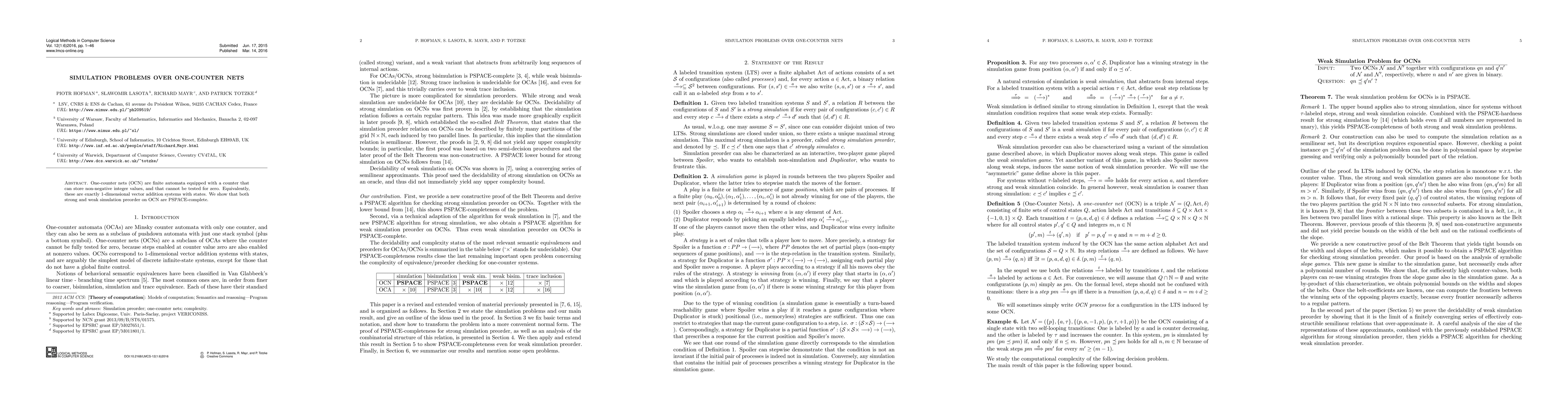 This paper demonstrates that both strong and weak simulation preorders for one-counter nets (OCN), which are 1-dimensional vector addition systems with states, are PSPACE-complete problems. The complexity highlights the computational challenges involved in simulating these systems.
