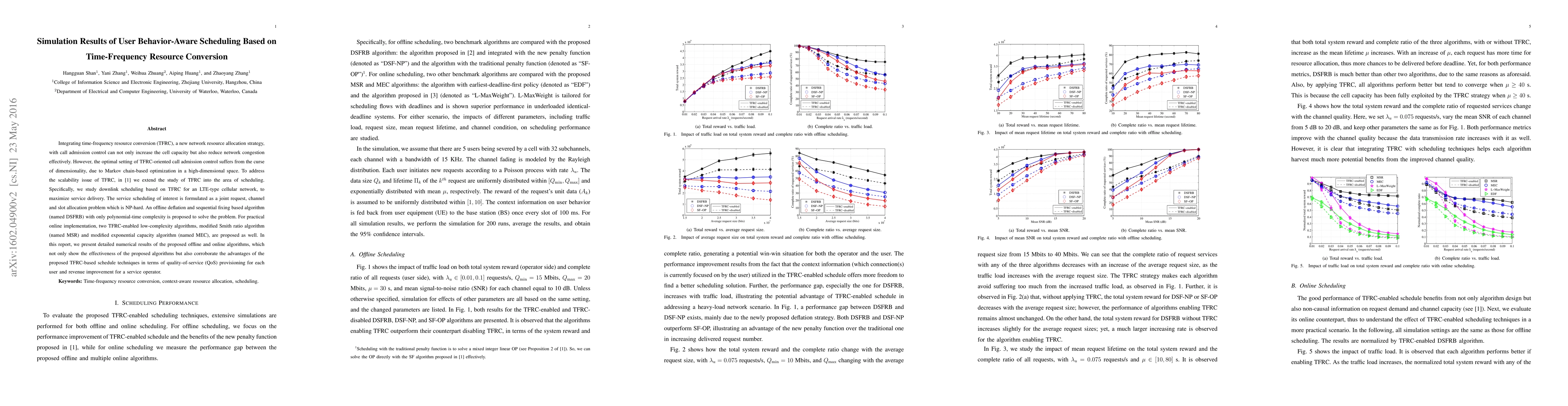 Integrating time-frequency resource conversion (TFRC), a new network resource allocation strategy, with call admission control can not only increase the cell capacity but also reduce network congestion effectively. However, the optimal setting of TFRC-oriented call admission control suffers from the curse of dimensionality, due to Markov chain-based optimization in a high-dimensional space. To address the scalability issue of TFRC, in [1] we extend the study of TFRC into the area of scheduling. Specifically, we study downlink scheduling based on TFRC for an LTE-type cellular network, to maximize service delivery. The service scheduling of interest is formulated as a joint request, channel and slot allocation problem which is NP-hard. An offline deflation and sequential fixing based algorithm (named DSFRB) with only polynomial-time complexity is proposed to solve the problem. For practical online implementation, two TFRC-enabled low-complexity algorithms, modified Smith ratio algorithm (named MSR) and modified exponential capacity algorithm (named MEC), are proposed as well. In this report, we present detailed numerical results of the proposed offline and online algorithms, which not only show the effectiveness of the proposed algorithms but also corroborate the advantages of the proposed TFRC-based schedule techniques in terms of quality-of-service (QoS) provisioning for each user and revenue improvement for a service operator.