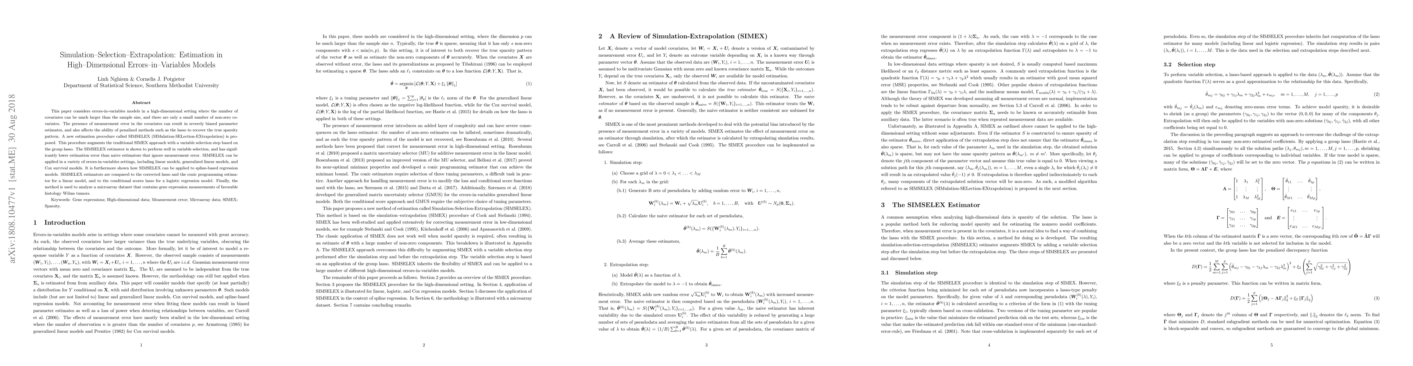 This paper proposes SIMSELEX, a new estimation procedure combining SIMEX with group lasso for high-dimensional errors-in-variables models, demonstrating improved variable selection and lower estimation error compared to traditional methods. The method is applicable to various regression models and is illustrated with a microarray dataset analysis.