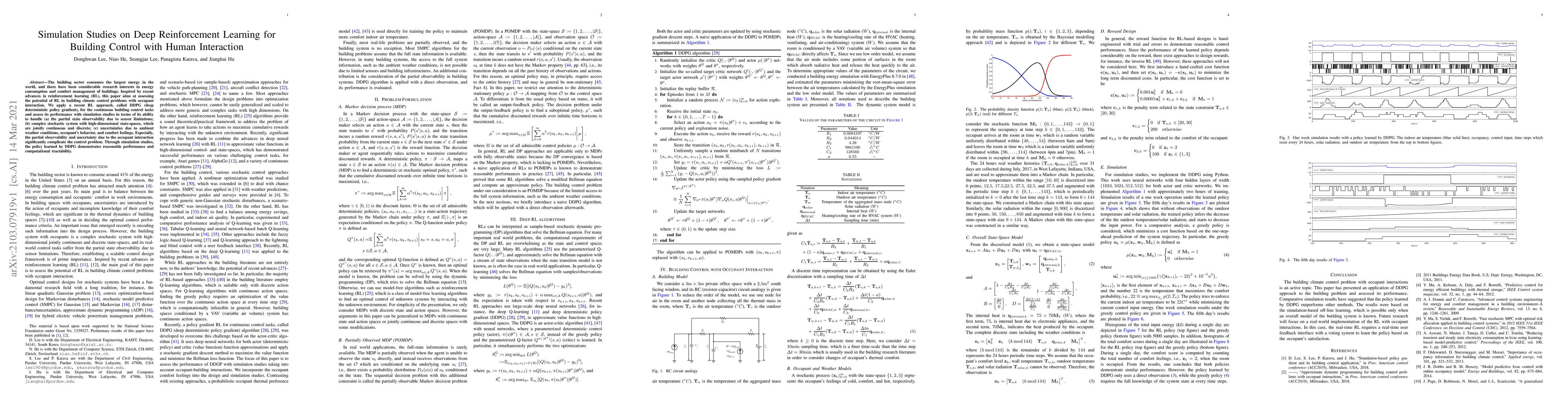 This paper evaluates the application of deep reinforcement learning (DDPG) for managing building climate control, considering occupant interaction. Simulation studies show that DDPG effectively handles partial state observability, complex stochastic systems, and uncertainties, demonstrating reasonable performance and computational feasibility.