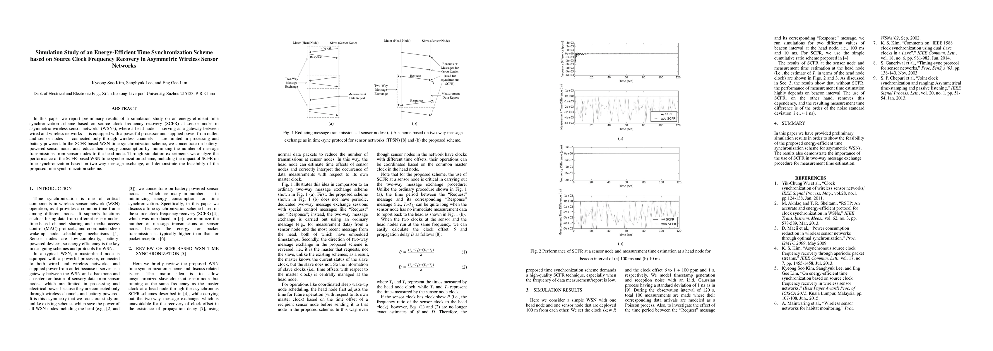 This paper presents a simulation study on an energy-efficient time synchronization scheme based on source clock frequency recovery (SCFR) in asymmetric wireless sensor networks. The proposed scheme minimizes energy consumption in battery-powered sensor nodes by reducing message transmissions, demonstrating its feasibility through simulation experiments.