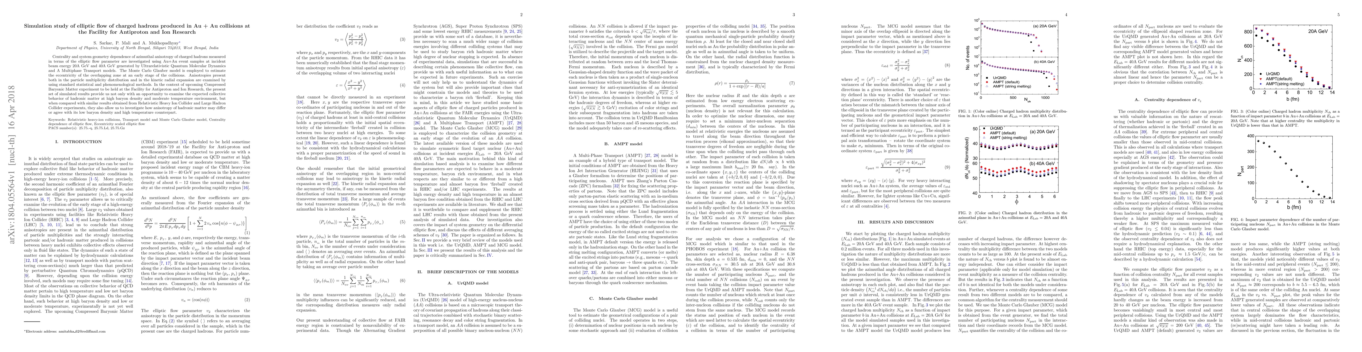 Centrality and system geometry dependence of azimuthal anisotropy of charged hadrons measured in terms of the elliptic flow parameter are investigated using Au+Au event samples at incident beam energy $20$A GeV and $40$A GeV generated by Ultrarelativistic Quantum Molecular Dynamics and A Multiphase Transport models. The Monte Carlo Glauber model is employed to estimate the eccentricity of the overlapping zone at an early stage of the collisions. Anisotropies present both in the particle multiplicity distribution and in the kinetic radial expansion are examined by using standard statistical and phenomenological methods. In the context of upcoming Compressed Baryonic Matter experiment to be held at the Facility for Antiproton and Ion Research, the present set of simulated results provide us not only with an opportunity to examine the expected collective behavior of hadronic matter at high baryon density and moderate temperature environment, but when compared with similar results obtained from Relativistic Heavy Ion Collider and Large Hadron Collider experiments, they also allow us to investigate how anisotropy of hadronic matter may differ or agree with its low baryon density and high temperature counterpart.