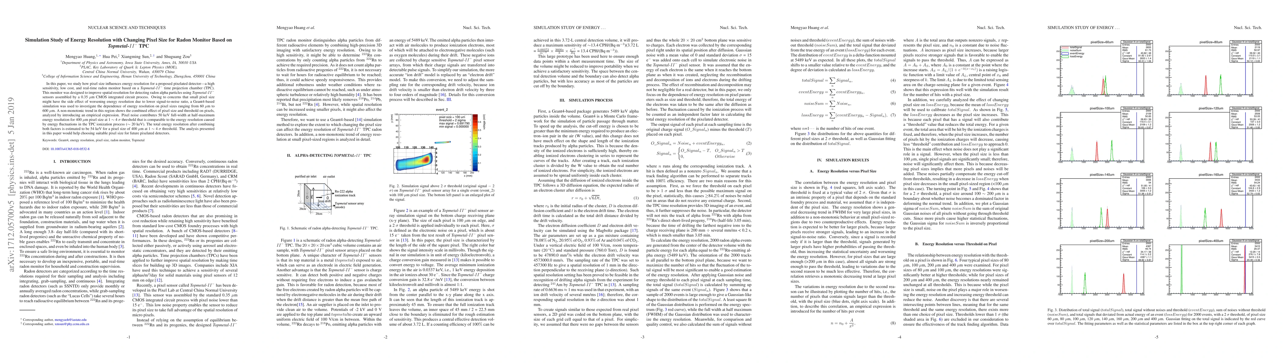 A simulation study investigates how pixel size affects energy resolution in a proposed radon monitor based on Topmetal-${II}^-$ time projection chamber (TPC), finding a non-monotonic trend with pixel size that can be modeled by an empirical expression.