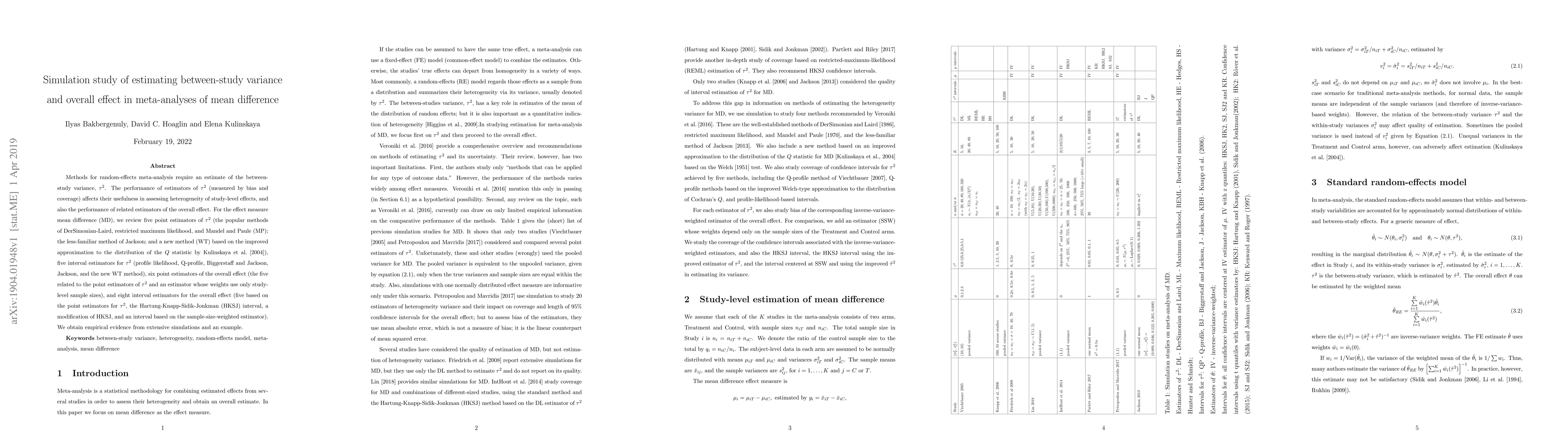 Methods for random-effects meta-analysis require an estimate of the between-study variance, $\tau^2$. The performance of estimators of $\tau^2$ (measured by bias and coverage) affects their usefulness in assessing heterogeneity of study-level effects, and also the performance of related estimators of the overall effect. For the effect measure mean difference (MD), we review five point estimators of $\tau^2$ (the popular methods of DerSimonian-Laird, restricted maximum likelihood, and Mandel and Paule (MP); the less-familiar method of Jackson; and a new method (WT) based on the improved approximation to the distribution of the $Q$ statistic by \cite{kulinskaya2004welch}), five interval estimators for $\tau^2$ (profile likelihood, Q-profile, Biggerstaff and Jackson, Jackson, and the new WT method), six point estimators of the overall effect (the five related to the point estimators of $\tau^2$ and an estimator whose weights use only study-level sample sizes), and eight interval estimators for the overall effect (five based on the point estimators for $\tau^2$, the Hartung-Knapp-Sidik-Jonkman (HKSJ) interval, a modification of HKSJ, and an interval based on the sample-size-weighted estimator). We obtain empirical evidence from extensive simulations and an example.